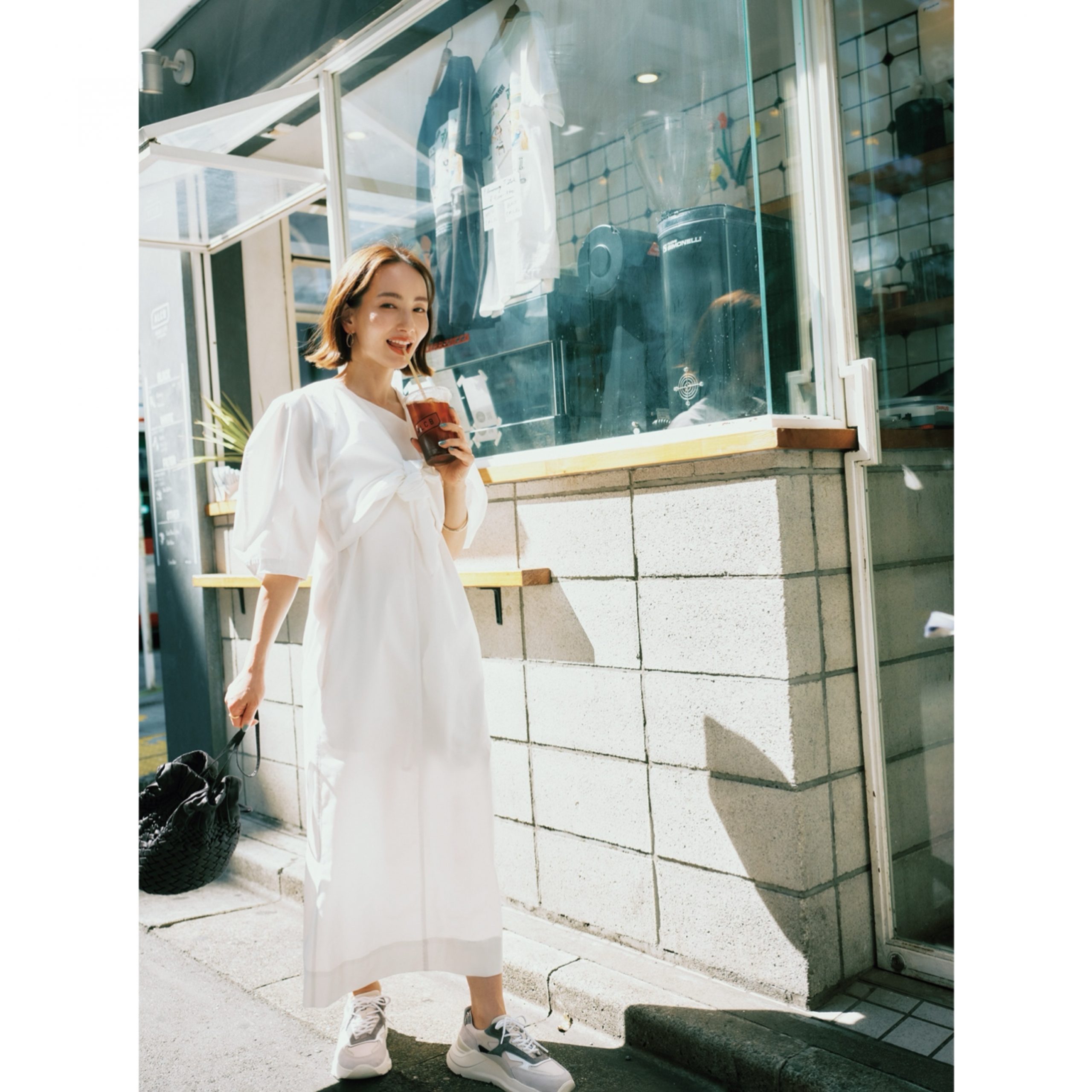 オールホワイトコーデには、グレーラインの白スニーカーがアクセントに!ボリュームソールなら足首を細く見せてくれるのも◎。甘いムードなぽわん袖のワンピもスニーカーで程よくカジュアルダウンして。