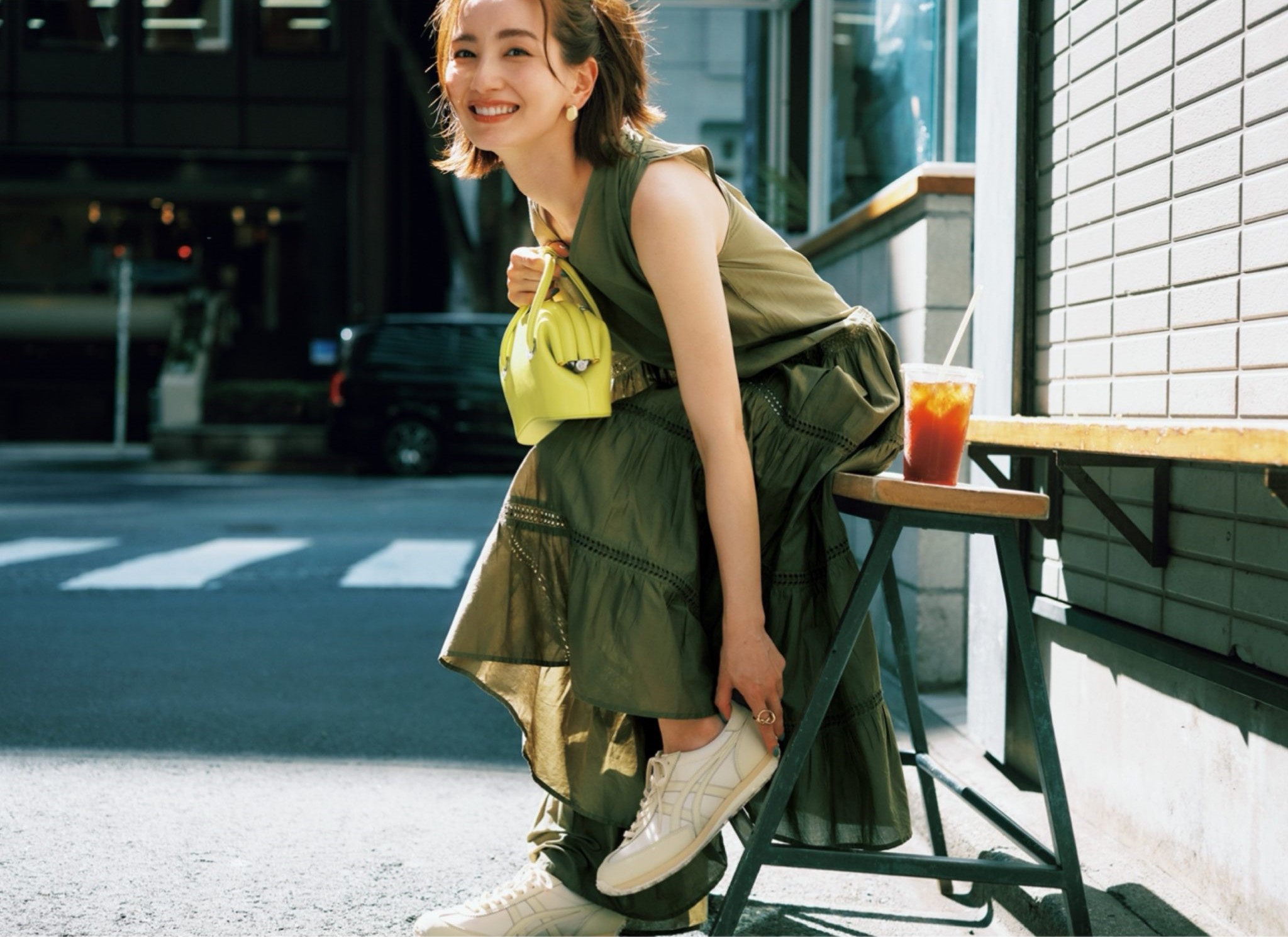 シックなカーキのワンピには、ビビッドイエローのバッグを差し色に!細身スニーカーを選べば、キレイめコーデにも合わせやすいんです◎。白スニーカーを更新したい時に、淡いベージュという選択もオススメ。