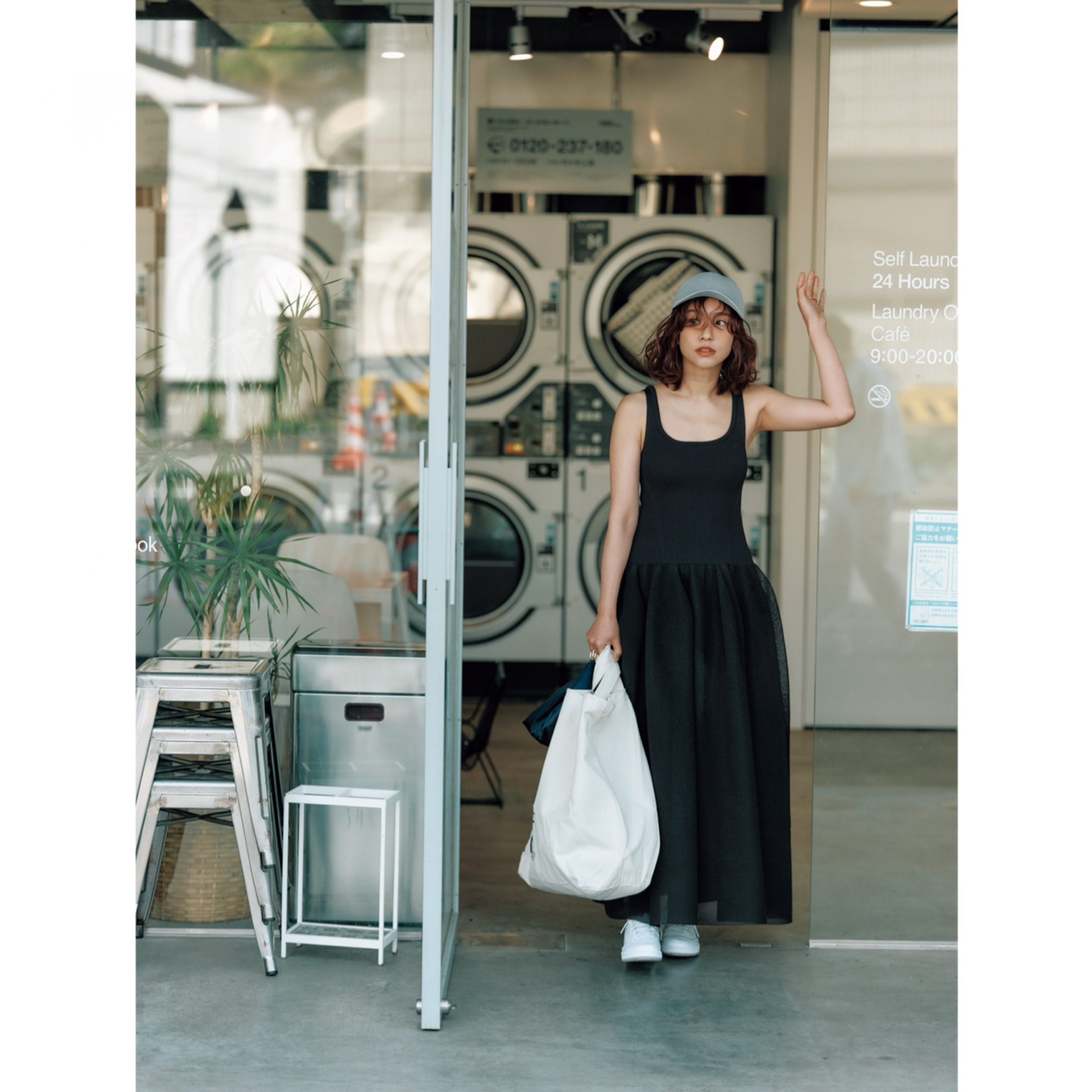ワンマイルコーデこそ、洗えるけど気分の上がるドラマチックなシルエットに頼りたい!キャップとスニーカーをONして、程よくカジュアルに。心地良くご近所オシャレを楽しんで。