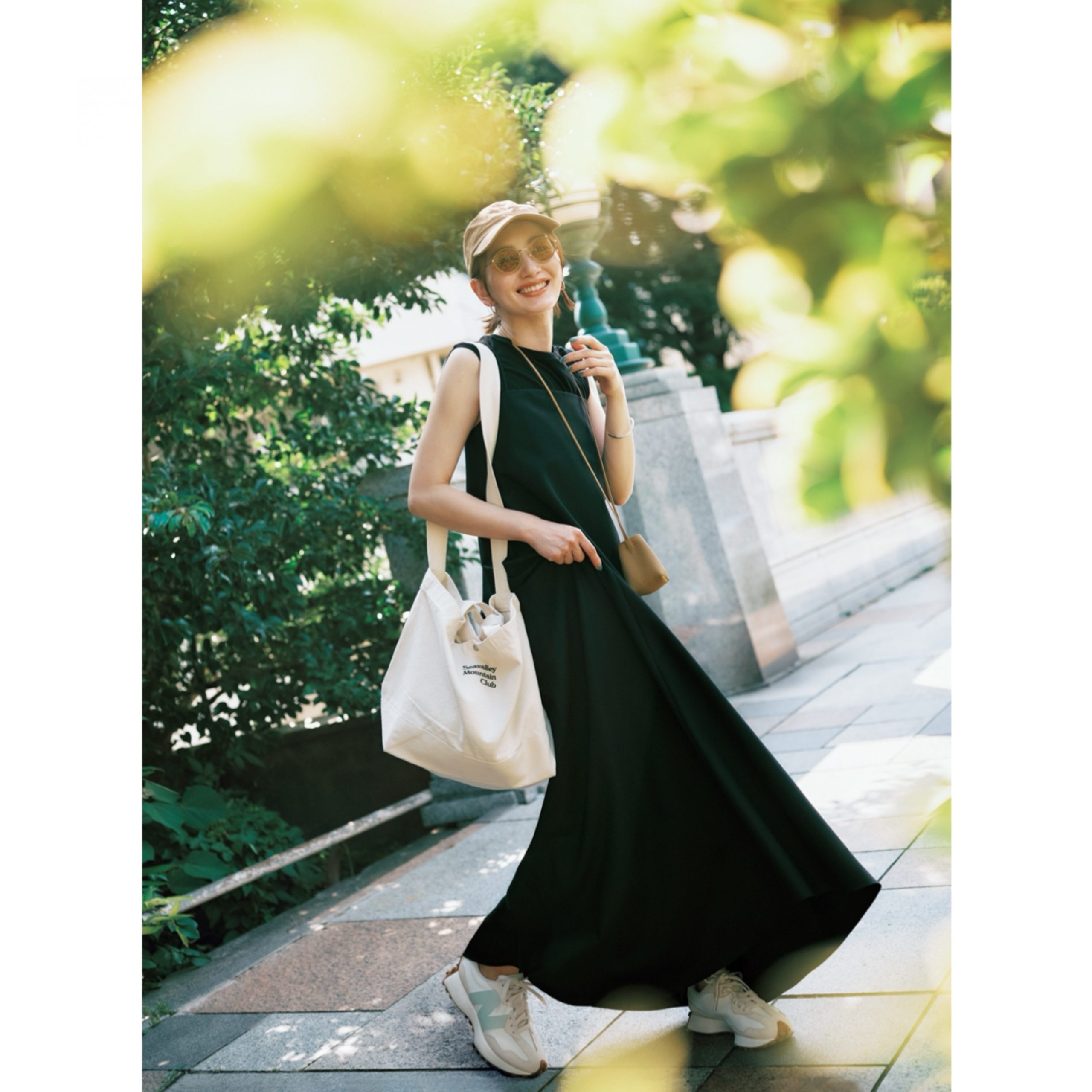 黒ワンピもカジュアル小物×スニーカーと組み合わせれば、公園にも行けちゃうスポーティコーデに!重たくなりがちなモノトーンの1日は、優しげカラーのニューバランスで軽快に◎