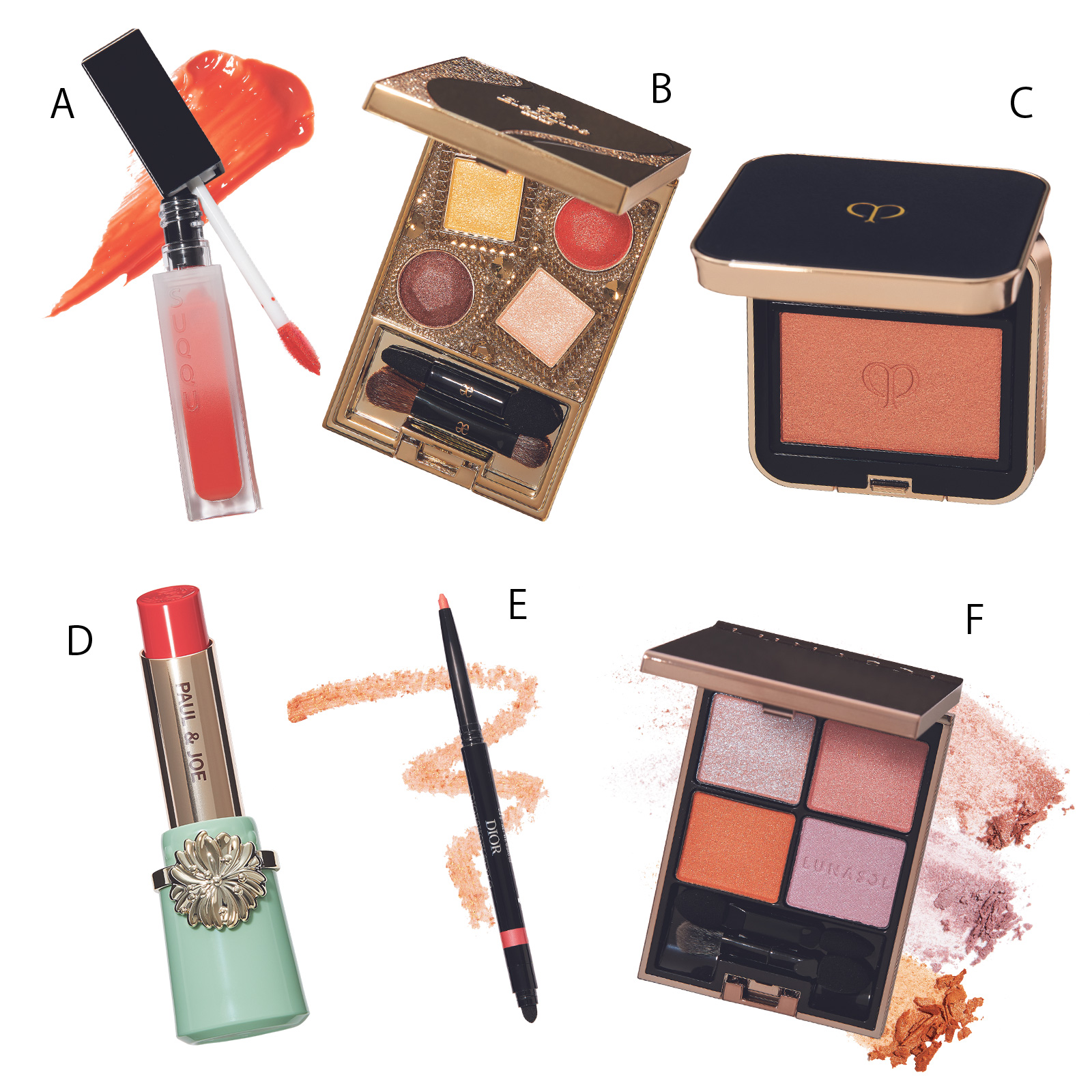Aぷっくりしたツヤ感もジューシーな、白みを含んだミルキーオレンジのリップ。手持ちリップに重ねてニュアンスチェンジも。SUQQU トリートメント ラッピング リップ 108 ¥4,400※限定(SUQQU)Bオレンジからブラウンまで、透明感の高い澄んだ発色とパールでヘルシーな陰影を。エレガンス ヌーヴェル アイズ 39 ¥6,050(エレガンス コスメティックス)Cクリーミーコーラル。スキンケア成分をオイルジェルで包み込み、長時間持続する透けツヤと発色に。クレ・ド・ポー ボーテ オンブルクルールソロ 104 ¥5,500※セット価格(クレ・ド・ポー ボーテ)D唇に溶け込みながら顔を明るくする血色ミルキーオレンジ。ポール&ジョー リップスティック 21 ¥3,300※セット価格(ポール&ジョーボーテ)Eパーリーなコーラルカラー。長時間滲まずに煌めくオレンジの発色が持続するから、下まぶたメークにも使いやすい。ディオールショウ スティロ ウォータープルーフ 646 ¥4,510(パルファン・クリスチャン・ディオール)F淡いオレンジとラベンダーで目元の透明感を引き出しながら、軽やかな血色感をプラス。ルナソル アイカラーレーション EX39 ¥6,820※限定(カネボウ化粧品)