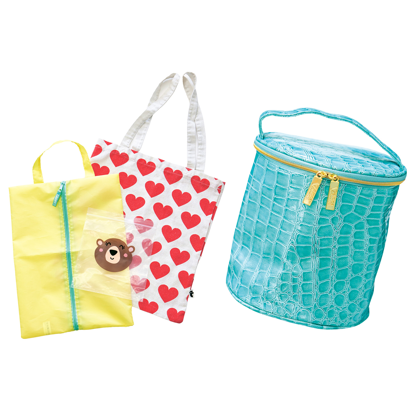 ②明るいグリーンのバニティポーチは神崎恵さん×ベルニカのコラボ。数年前にゲットしてから大切に使っています。ハートの手提げ袋、イエローのシューズケース、クマさんの保存袋はフライングタイガーで購入。ビニール素材なので軽くて破れないし、なによりかわいい♡
