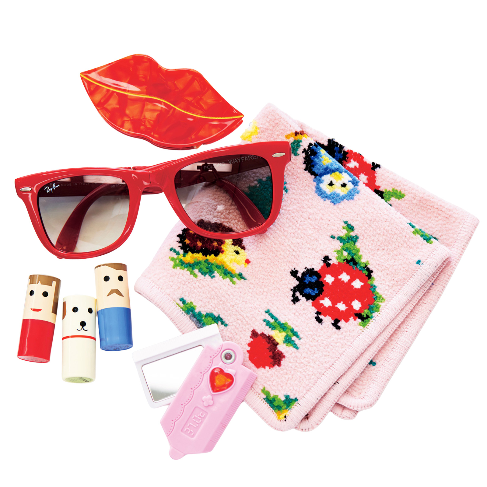 ①お気に入りのフェイラーのハンカチ、折りたためるRay-Ban®のサングラス、赤い唇のヘアクリップ、資生堂のお人形リップは主人の台湾土産、ミニミラーは息子からのプレゼントです。