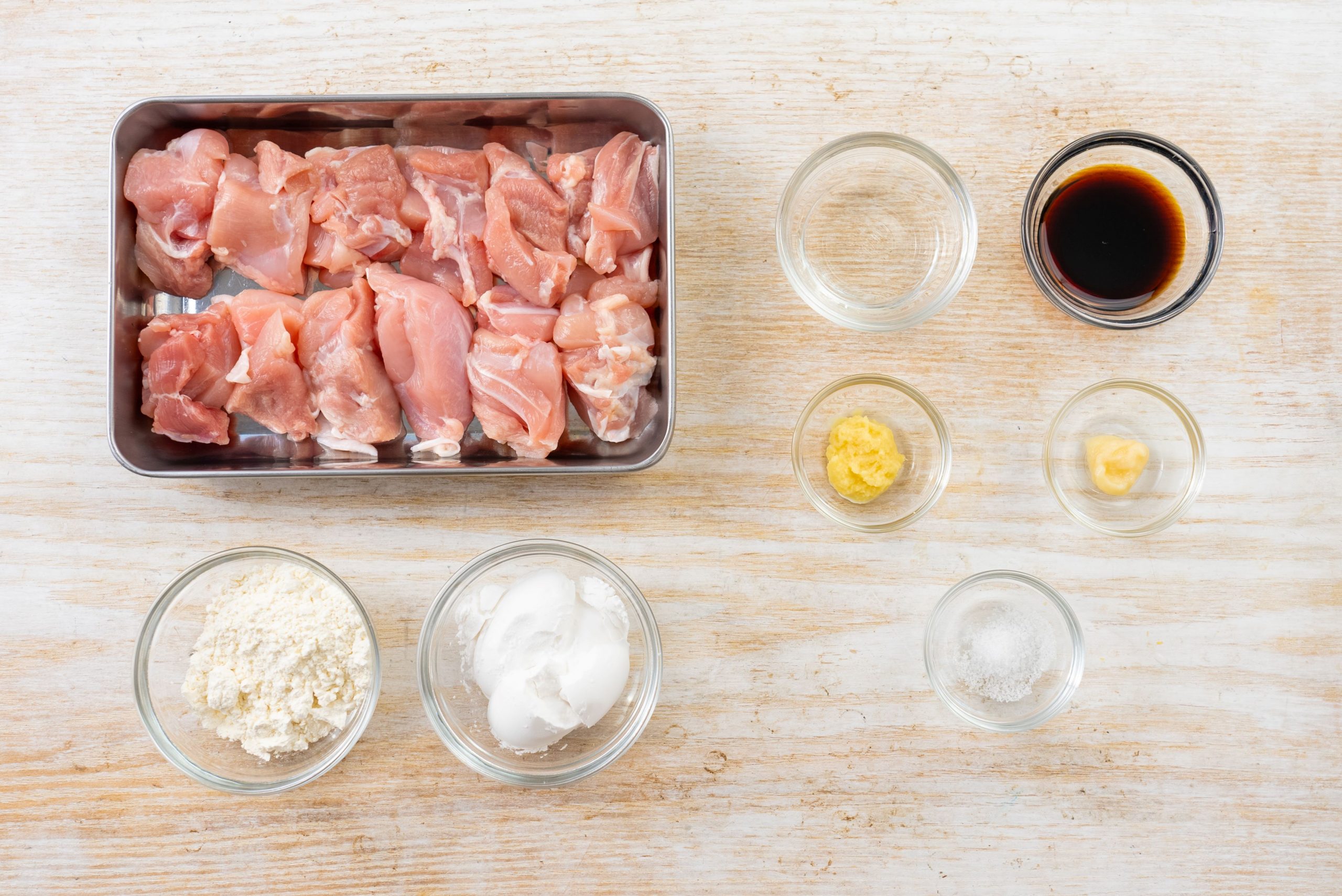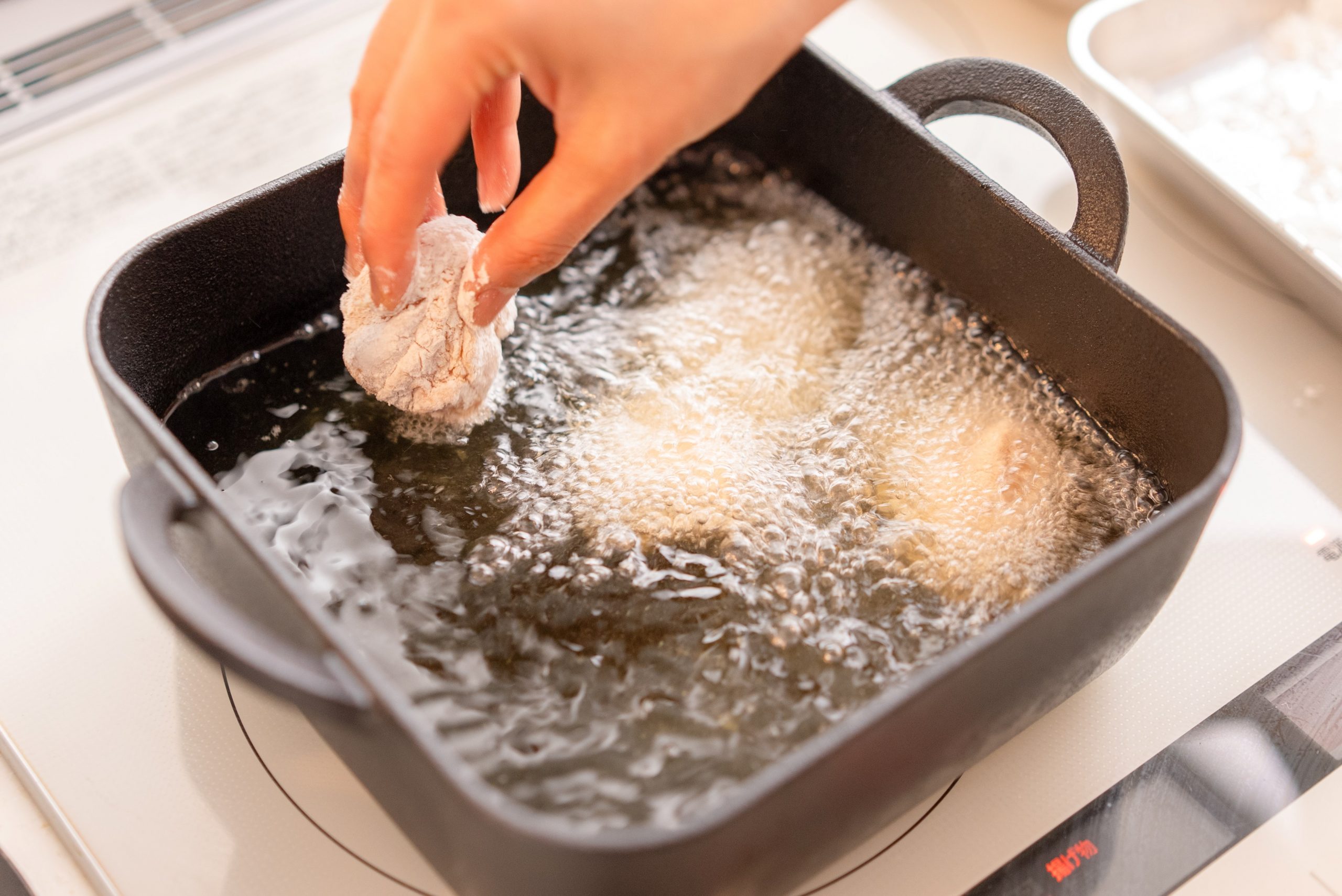②鍋に油を中温で熱し、①に片栗粉と薄力粉を混ぜ合わせた衣をつけて揚げる。中まで火が入ったら、高温にして1分ほどカラッと揚げる。