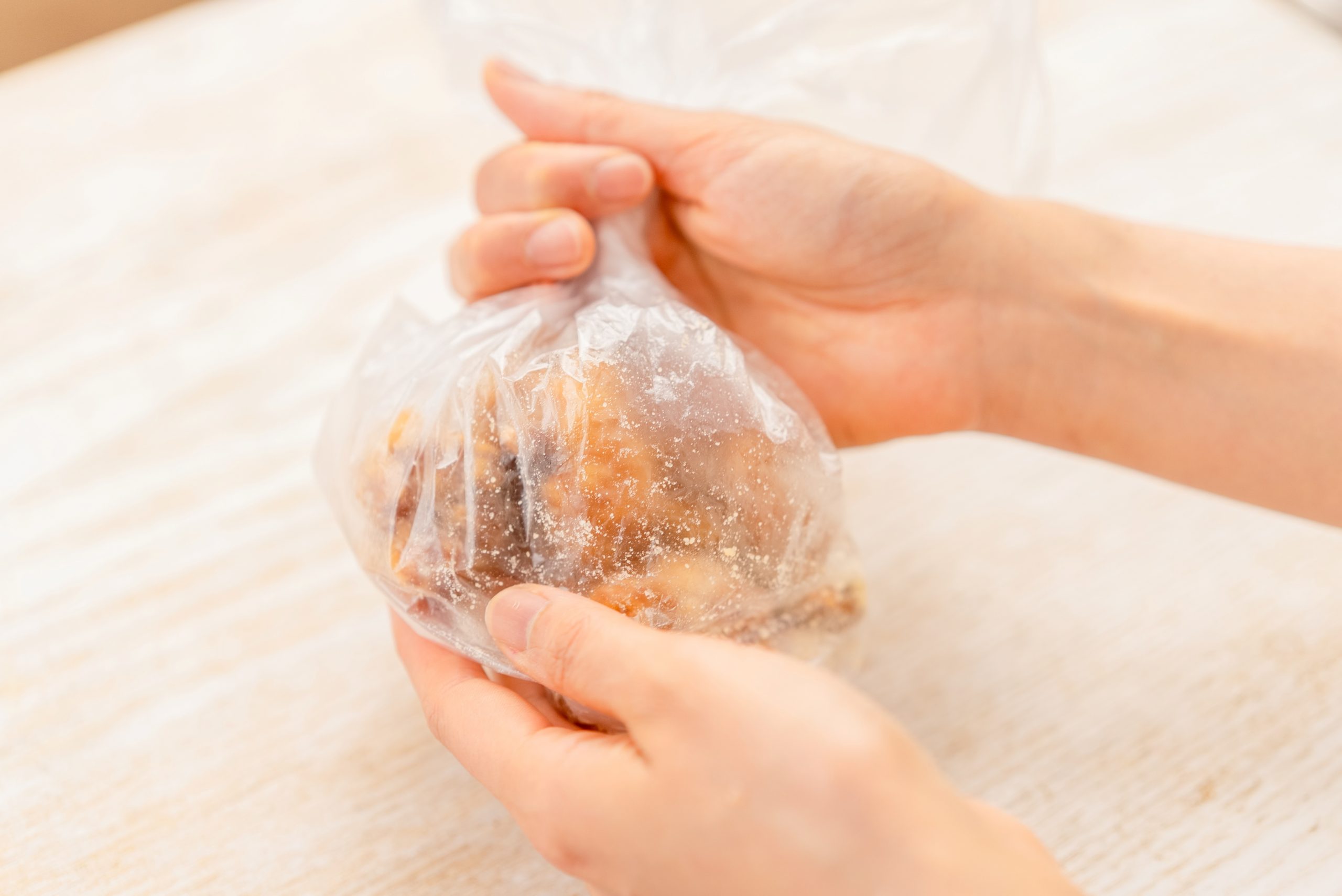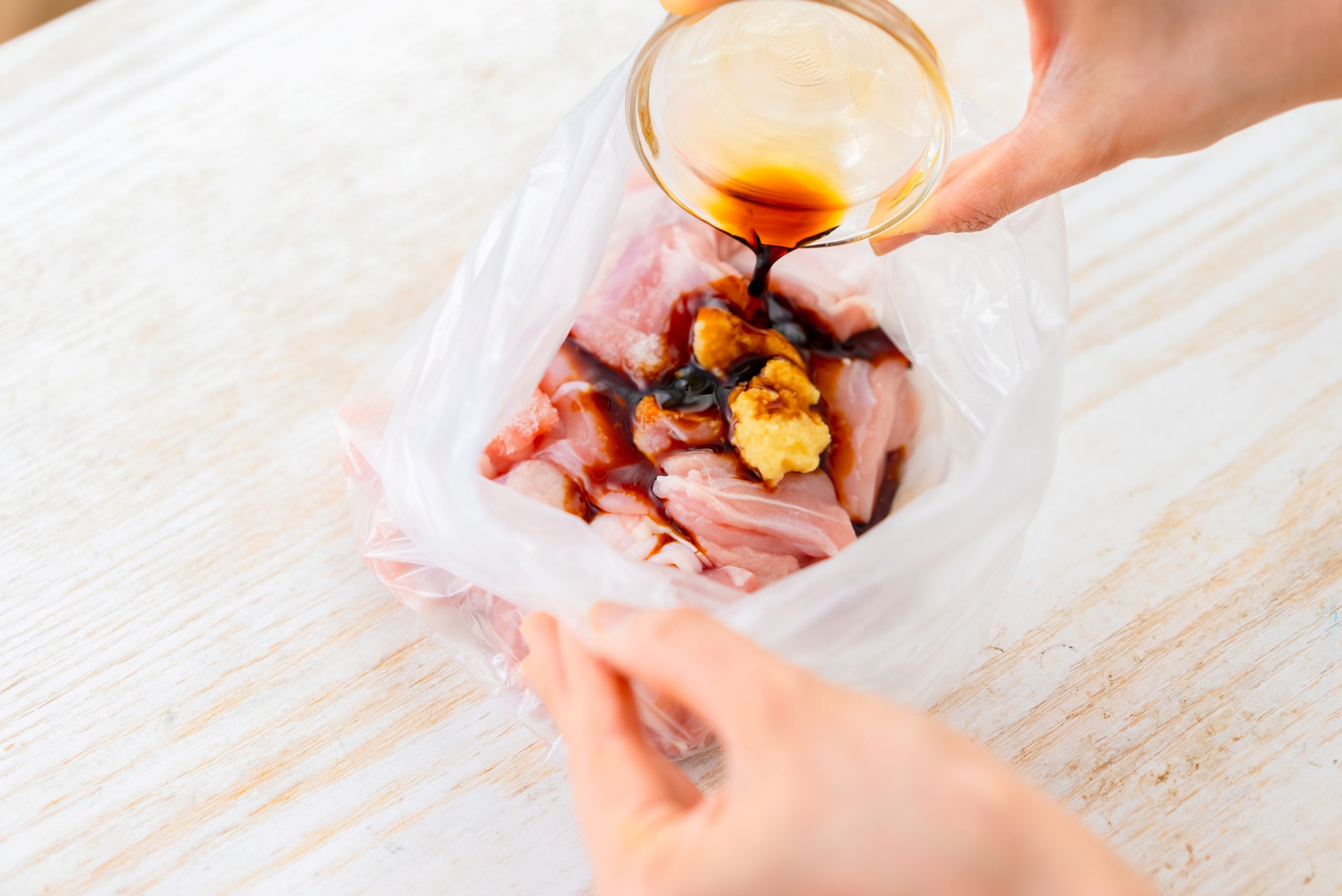 ①鶏もも肉はポリ袋に入れ、Aを加えて30分〜ひと晩漬ける。