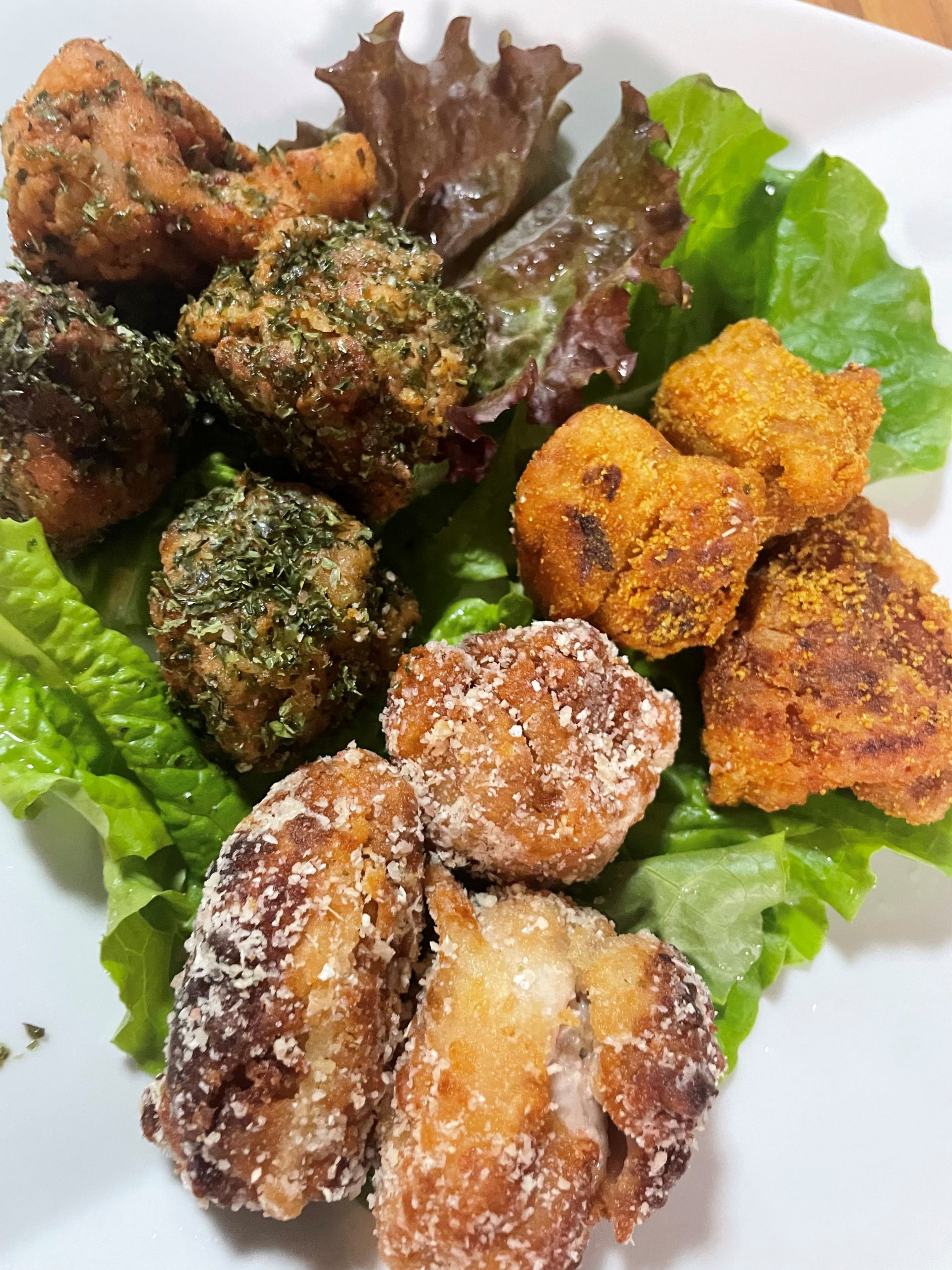 シンプルな唐揚げにフレーバーをまぶしてお好みの味に!いつもの唐揚げが簡単に変身しますよ♪唐揚げは二段階揚げでカラッと仕上げるのがポイントです。