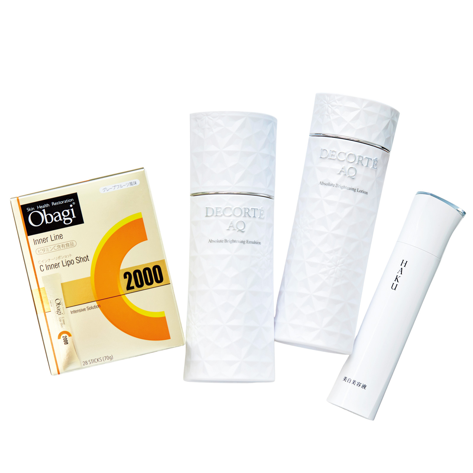 ②コスメデコルテAQの化粧水と乳液は美STの付録をきっかけに購入しました。HAKUの美白美容液はリピ買い。オバジCのC2000を毎日2包飲み、ビタミンCを摂取しています。