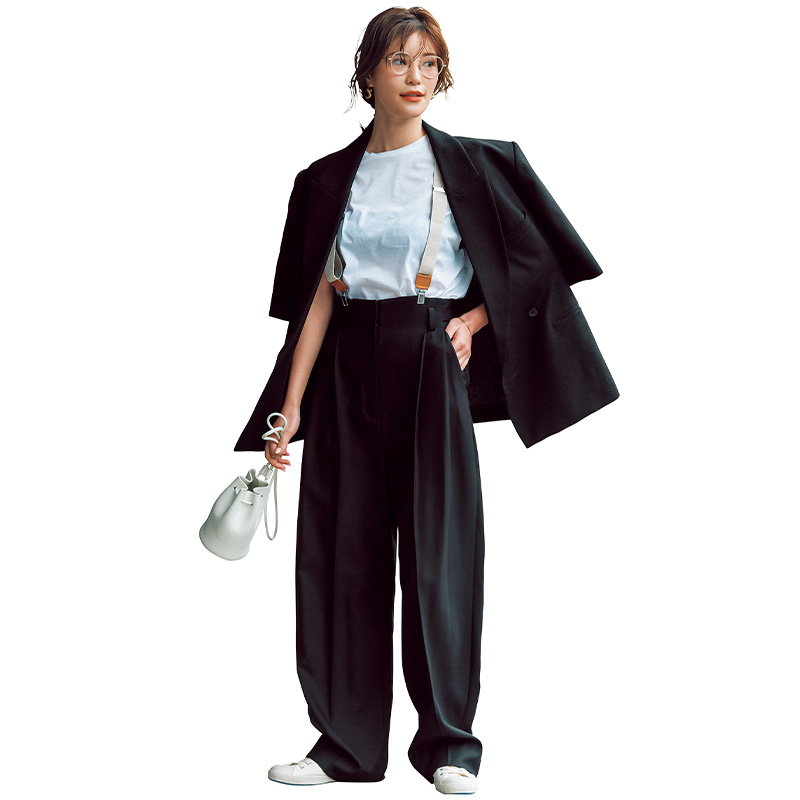 ジャケット¥62,700パンツ¥41,800(ともにイロット/ザ・ウォールショールーム)バッグ¥37,400(アエタ×イレーヴ)、カットソー¥13,200(ともにイレーヴ)メガネ¥38,500(アイヴァン/アイヴァン 東京ギャラリー)サスペンダー¥18,480(オブラダ/シンチ)ピアス¥28,600ブレスレット¥17,600(ともにローラ ロンバルディ/八木通商)スニーカー¥9,350(ムーンスター/ムーンスター カスタマーセンター)インナー(スタイリスト私物)