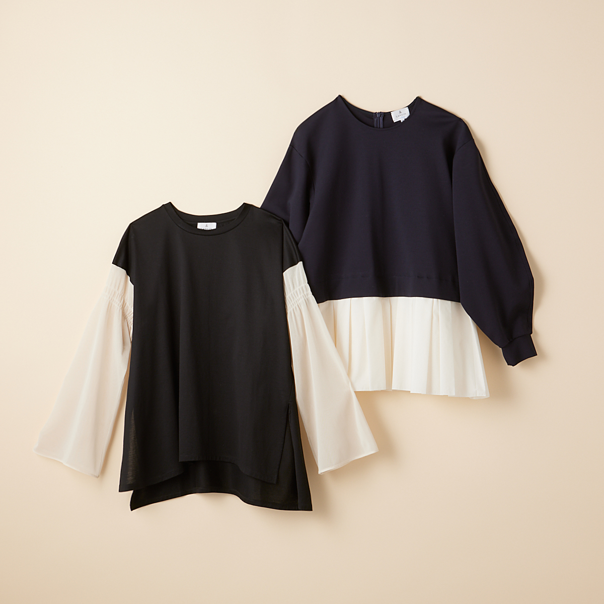 バランスのいい甘さが持ち味のランバン オン ブルーでは、袖コンシャスなカットソーアイテムが揃います。右は袖がバルーンシルエットになっており二の腕をカバーしつつ洒落感をプラス。着るだけで「手をかけている感」がゲットできます。左のロンTはフレア袖がドラマチックに動き、エレガントな印象に。カットソー【左から】¥15,400 ¥25,300(ともにLANVIN en Bleu)