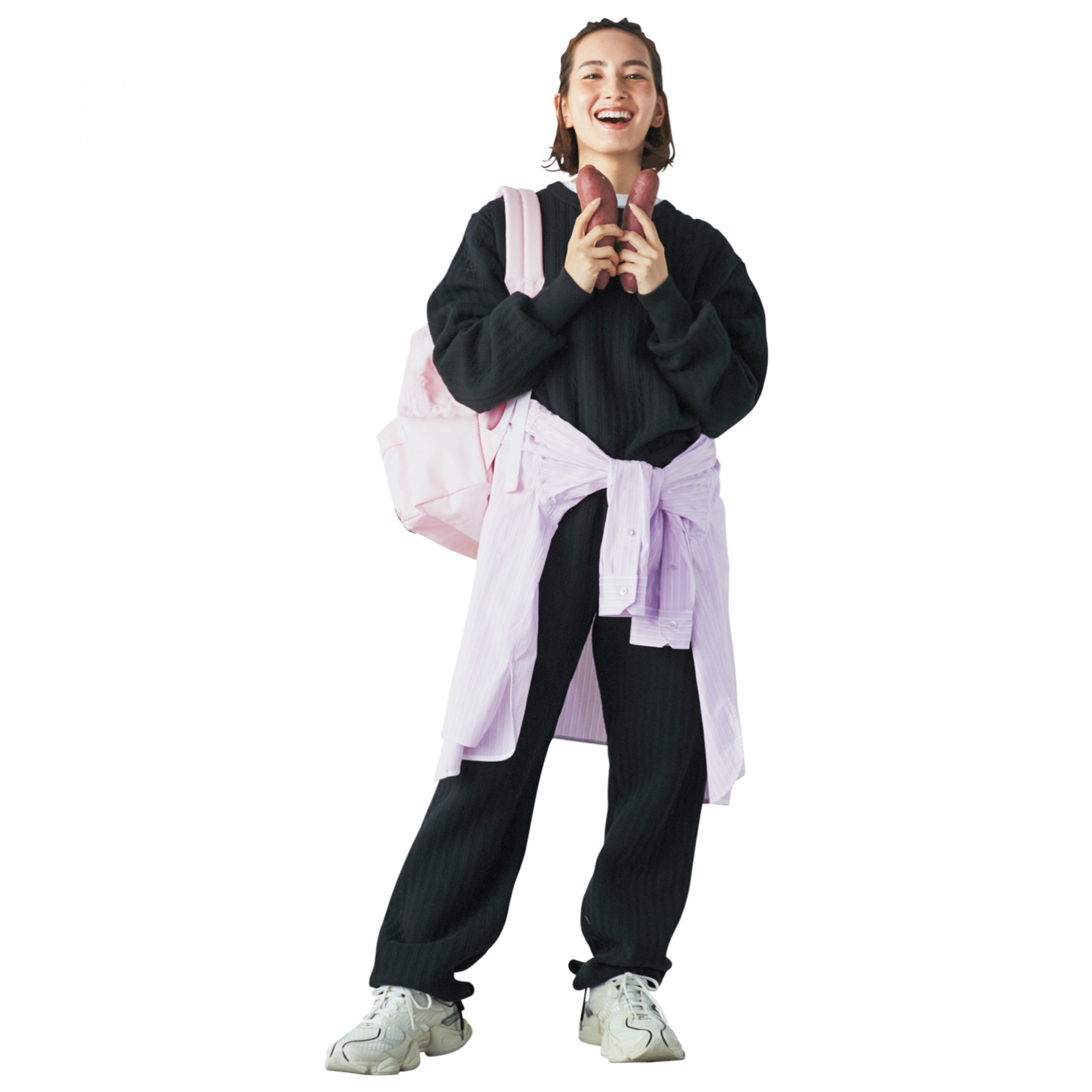 リラクシーな印象のスウェットのセットアップも、ボリュームスニーカーでスタイルアップが叶う! オールブラックのアクセントにピンク小物を追加すれば、キレイめカジュアルの完成。