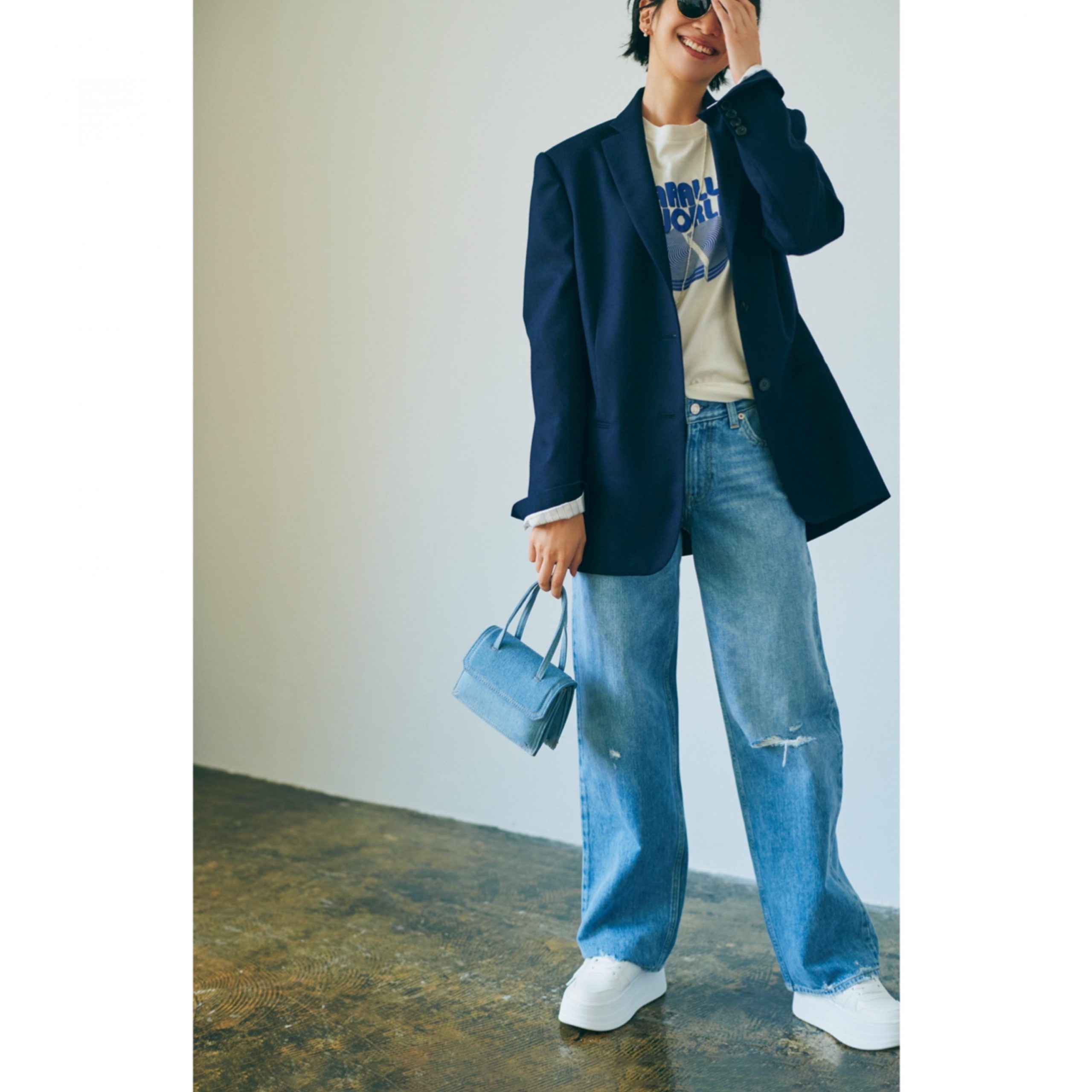 さりげなくダメージ加工の入ったデニムを主役に引き立てる、厚底スニーカーとネイビージャケットでお出かけムードを盛り上げたい!スニーカーが苦手でも厚底ならコンサバに履ける◎