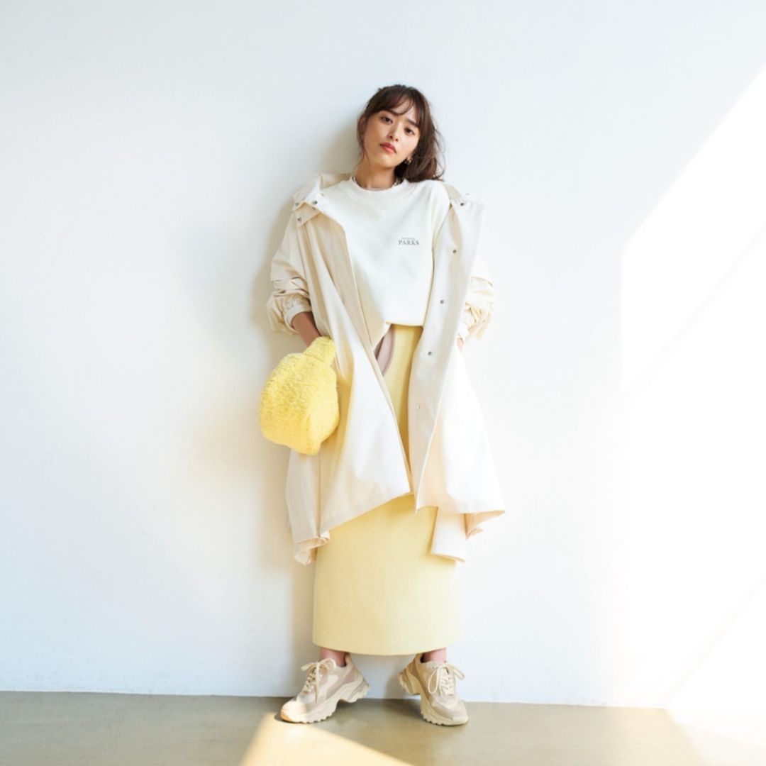 まろやかな優しげカラーでまとめれば、甘カジュアルが簡単にでき上がり。ベージュ配色のダッドスニーカーはスカートにも合わせやすい!