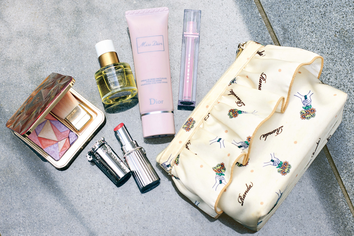 エルメスのネイルオイルやDIORのハンドクリームで、夏でも手のケアを怠りません。イプサのリップ(05番)の上にWAKE MAKEのリップグロス(12番)を重ね、頰や額はクレポの大人気パウダー(201番)で肌も唇もツヤツヤ。