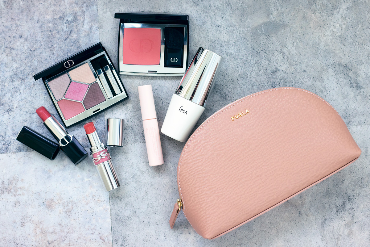 最近購入したイプサのUV乳液、ヘビロテしているDIORのチーク、アイシャドウ、ルージュ(458番)、お仕事にはYSLのリップ(150番)、エテュセのプライマーをFURLAのピンクポーチに入れて持ち歩いています。
