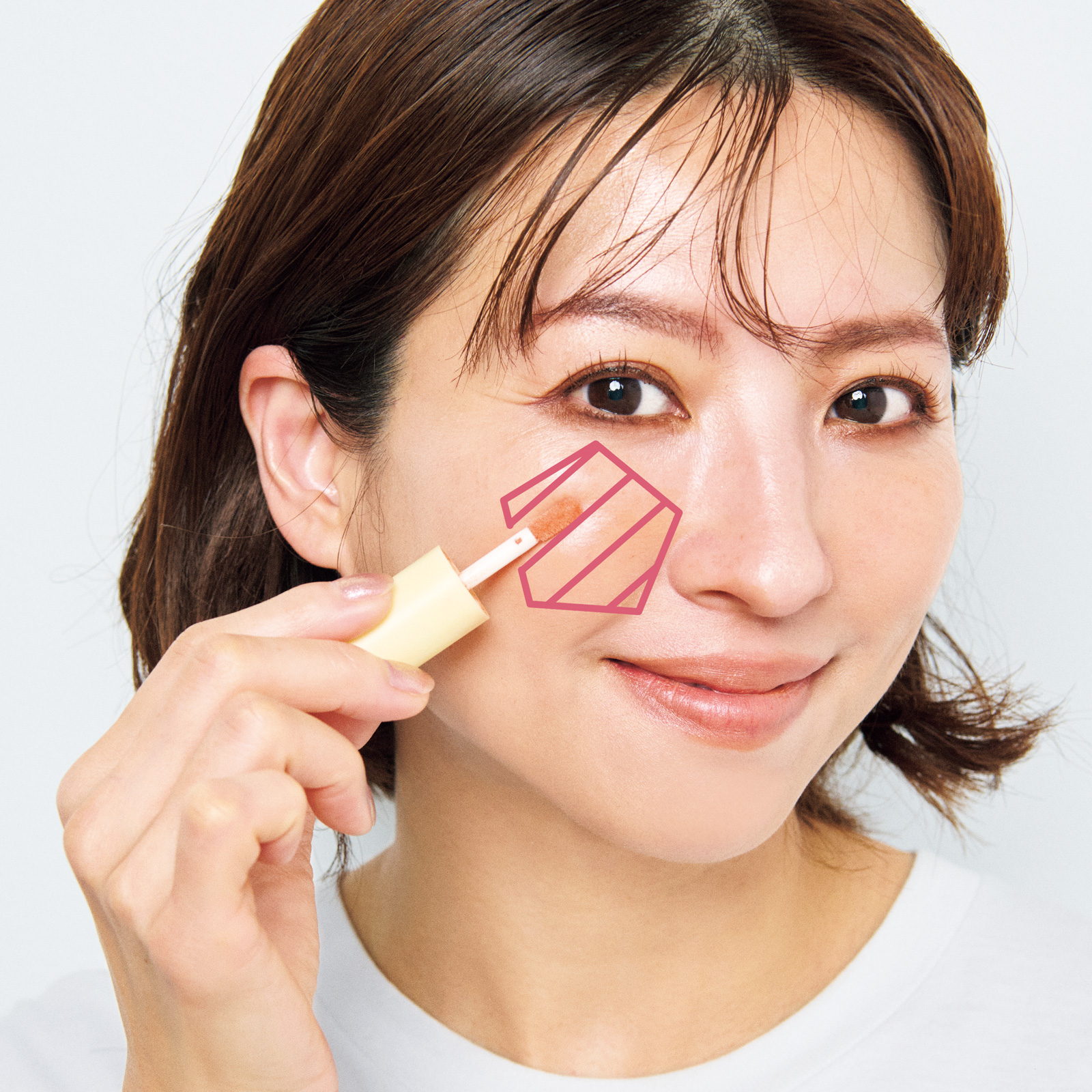 ①ベージュチークを頰のやや内側に置き、指やスポンジで五角形になじませます。顔が大きく見えないよう、頰の外側に広げるのはNG