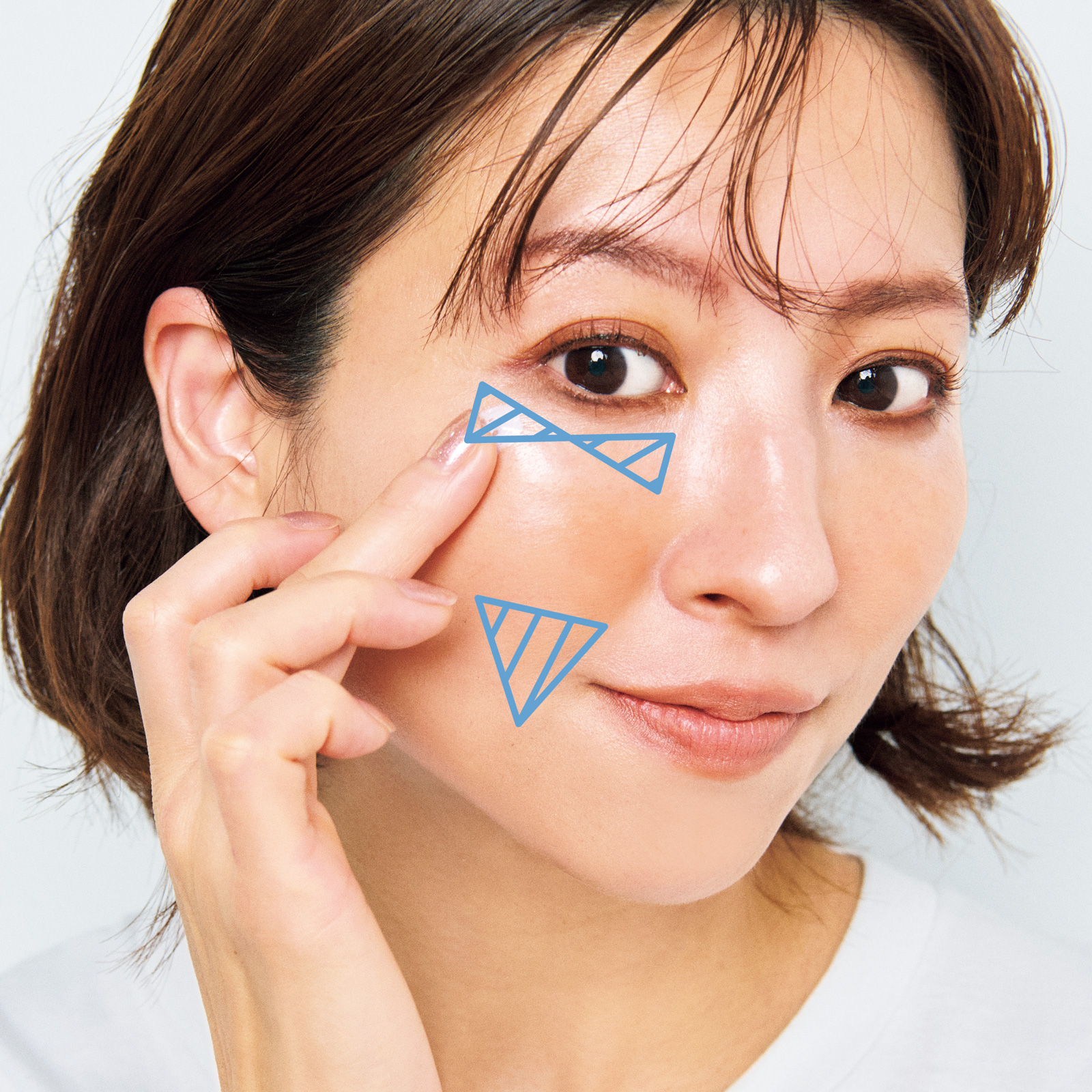 ②目の下にリボン型、頰骨の下に逆三角形にブルーチークをなじませます。影感を払拭し、透明感を与えて涼しげな表情になります
