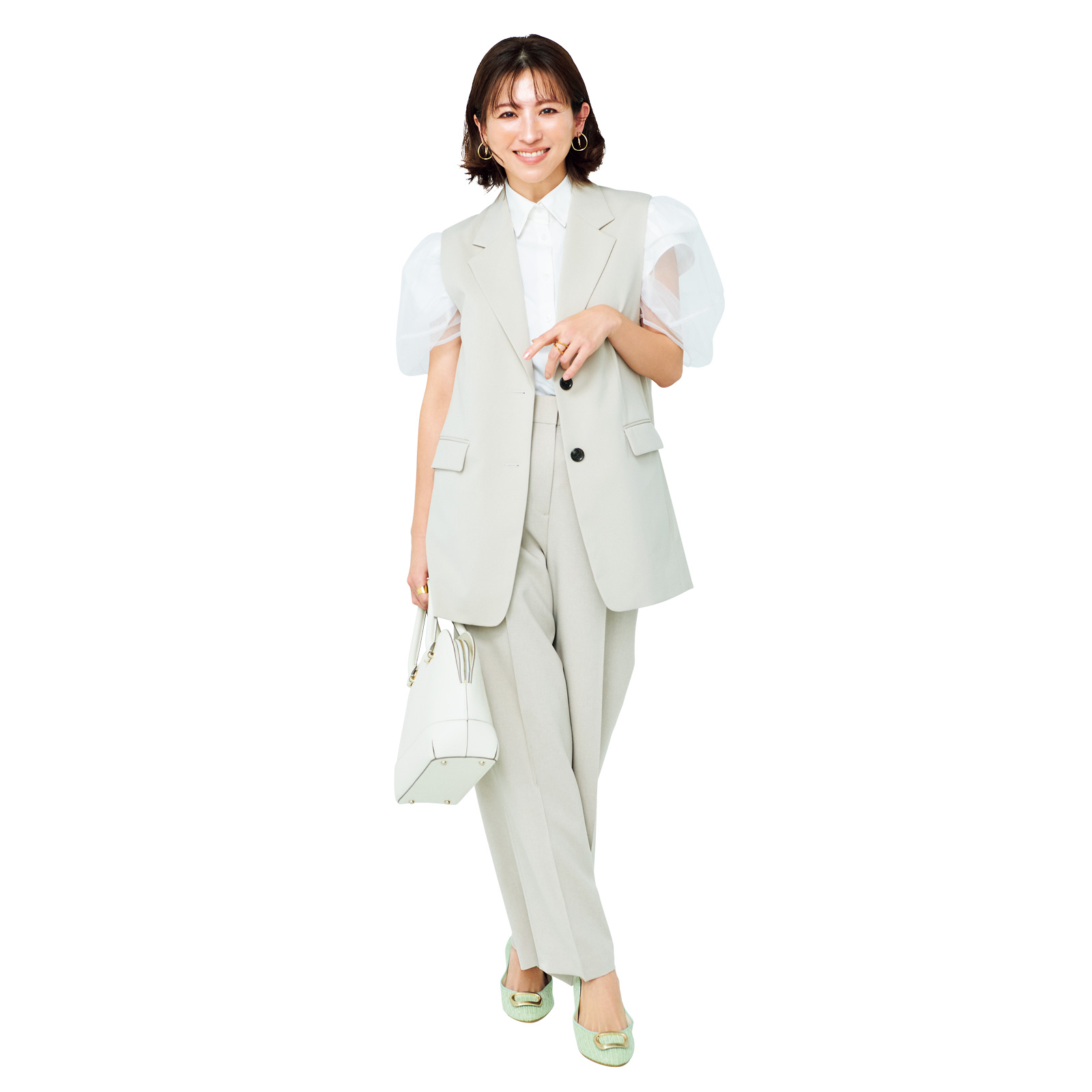 ジレ¥3,990(GU)シャツ¥17,600(シークレット・トロフィー)バッグ¥22,000シューズ¥16,500(ともにダイアナ/ダイアナ 銀座本店)イヤリング¥2,420(アネモネ/サンポークリエイト)右手リング¥16,500左手リング¥16,500(ともにete)パンツ(スタイリスト私物)