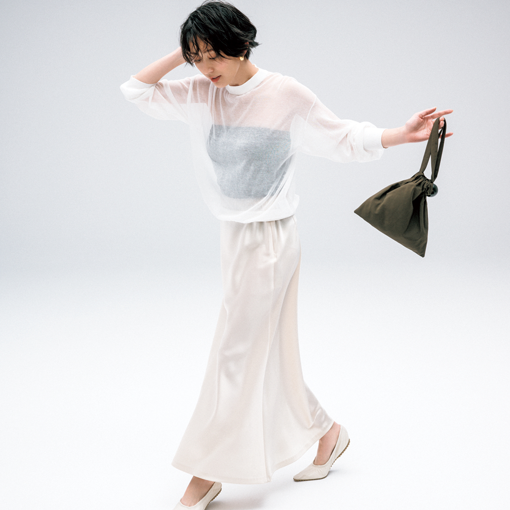 ふんわりシルエットのシアーニットには、思い切ってベアトップを提案します。すっきりインナーでバランスよく、女っぽさも◎。インナー、トップス、スカートはすべてル フィル、バッグはバケットバゲージ、靴はモダンウィーヴィングのもの。