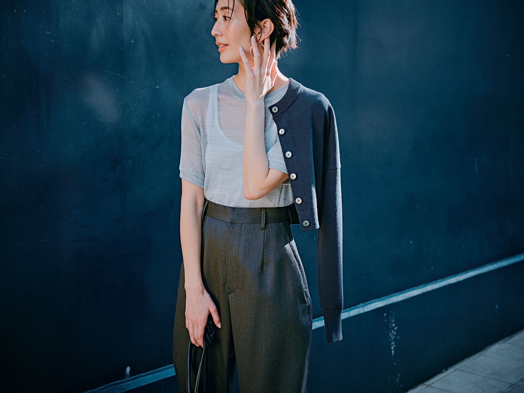 一枚では難しくても、シアートップスを重ねればトライしやすい大胆カットのタンクトップ。背中もガッツリ開いているスクープネックデザインが今年らしい。肌の透けて見える面積は大きいですが、タンクトップのヘルシーさで程よい色っぽさに収まります。インナーはバナナ・リパブリック、トップスはエイチ ビューティ & ユース、パンツはロエフ、カーディガンはナゴンスタンスのもの。