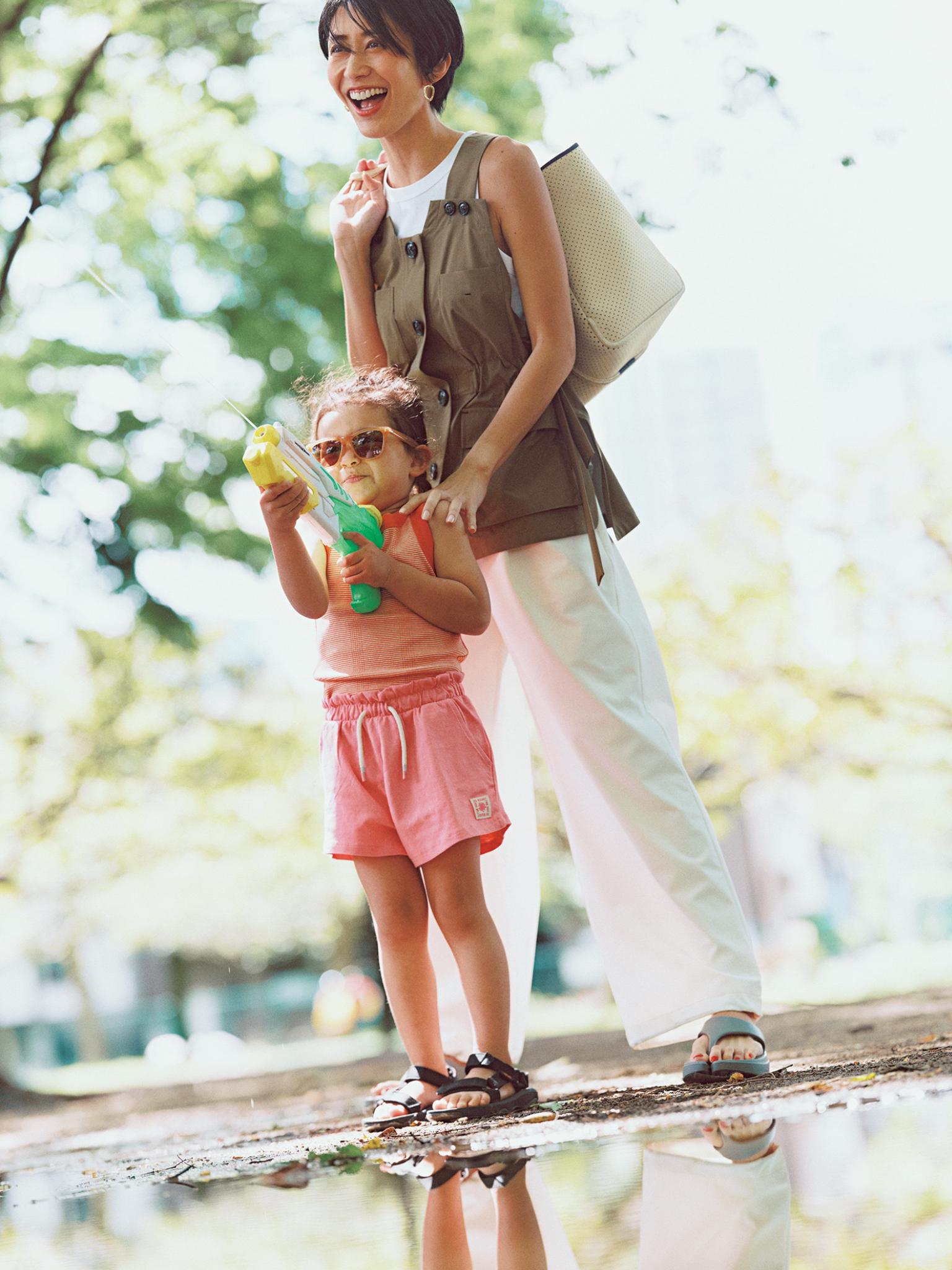 夏のワンツーコーデに白デニムが活躍。カーディガンをトップスとして着ることで、ただのカジュアルで終わらない凝ったオシャレに。撥水&防汚機能付きの白デニムは、雨の日や水遊びだけでなく、子連れの外食の時も便利です。パンツはヤヌーク、カーディガンはコルデラ、バッグはカタルツィ 1910、サンダルはスリーパーズのもの。