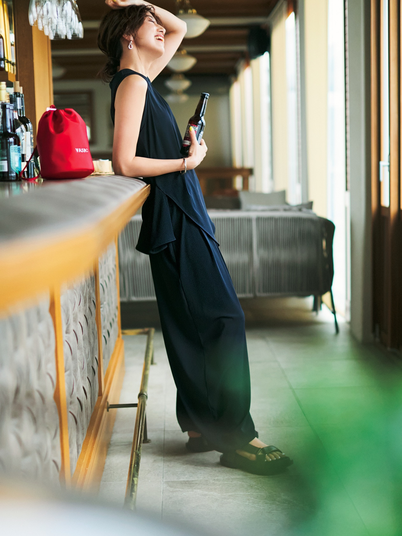 水着素材のモードなセットアップで、大人なTPOもクリア