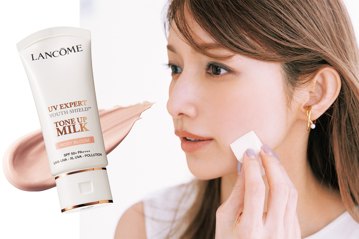 スポンジを使ってムラなく均一に。トーンアップUVといえばのランコムの名品が進化!紫外線、可視光線、赤外線の3つの太陽光線にアプローチし色素沈着が起こりにくい肌に。UV エクスペール トーン アップ ローズ N SPF 50+・PA++++ 30ml ¥7,480(ランコム)