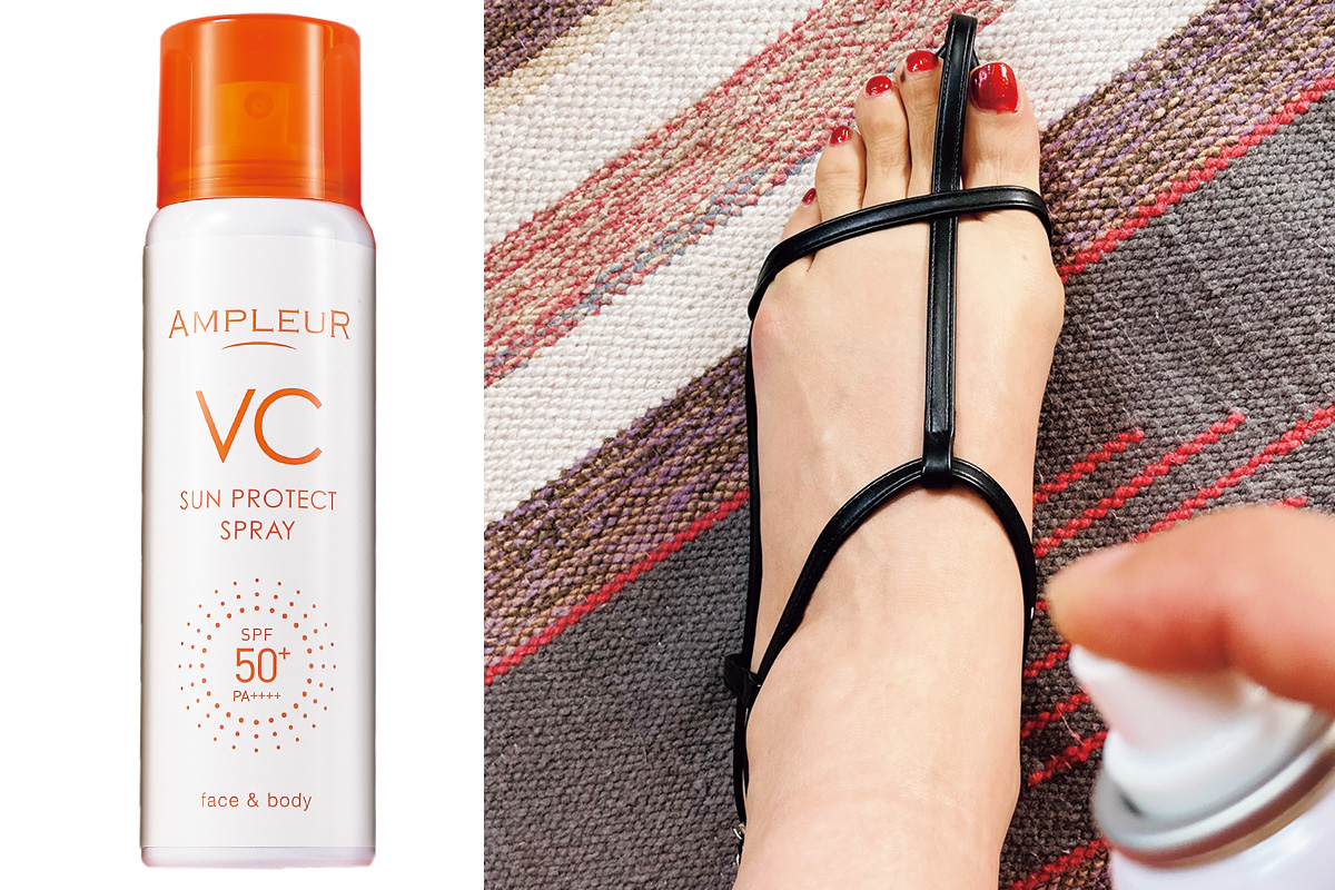 一度できると消えにくい“サンダル焼け”。外出先でも塗り直しの習慣をつけるのも大事です。円を描くようにまんべんなく、目安は肌がしっとりするくらいスプレーを。