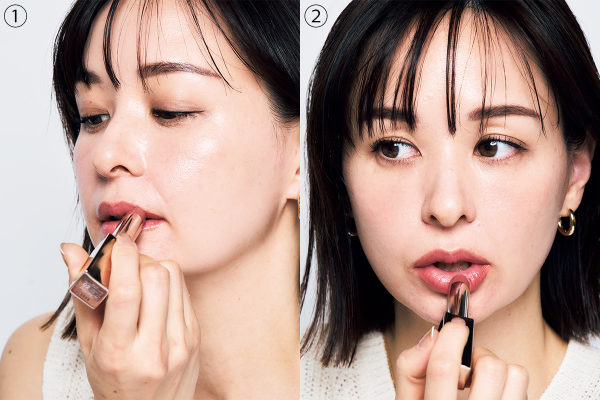 ①輪郭をはっきり取りたいときは、まず口角の輪郭を決めて。リップの先端で、口角の四隅の境をなぞるように塗布します。