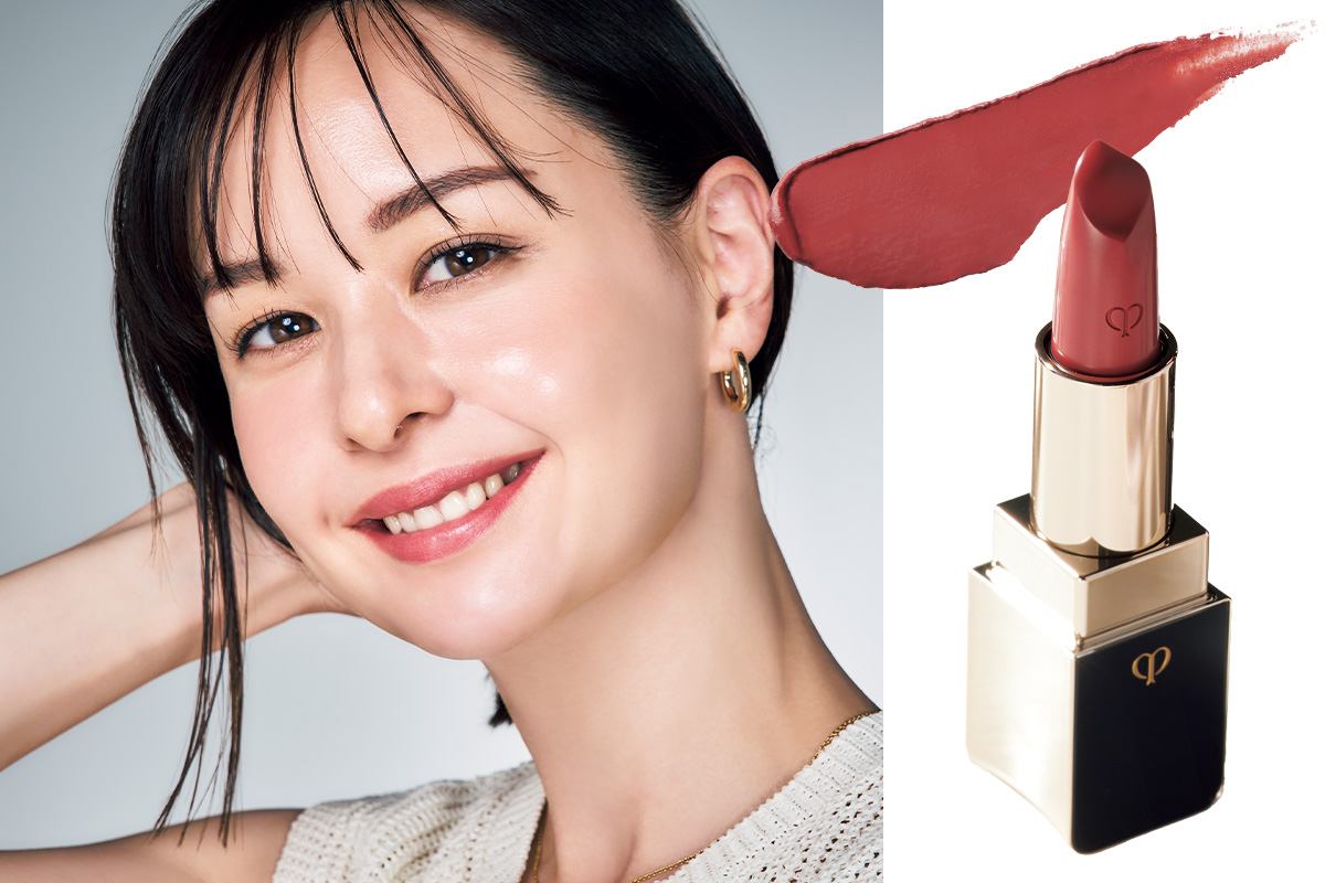 さりげなくも印象的なクラシカルなカラーであり、まさに大人のくすみピンク。艶やかな仕上がり、なめらかな心地よさ、うるおい持続の三拍子が叶う。ルージュアレーブル 13 ¥6,600(クレ・ド・ポー ボーテ)