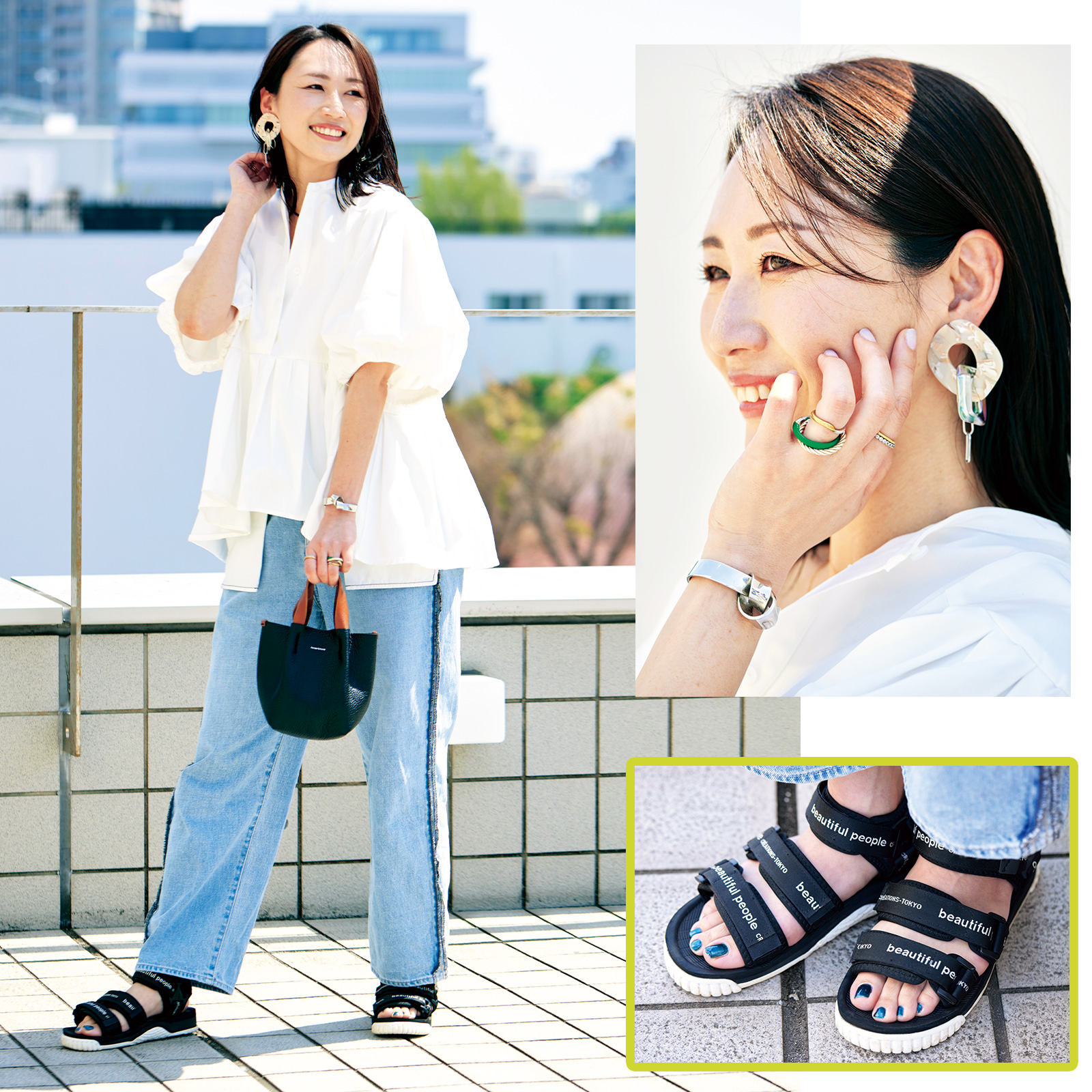 右上:ピアスはMamimi、バングルはセリーヌ、リングはボッテガ×gram、キュービックジルコニアなど存在感のあるものを。