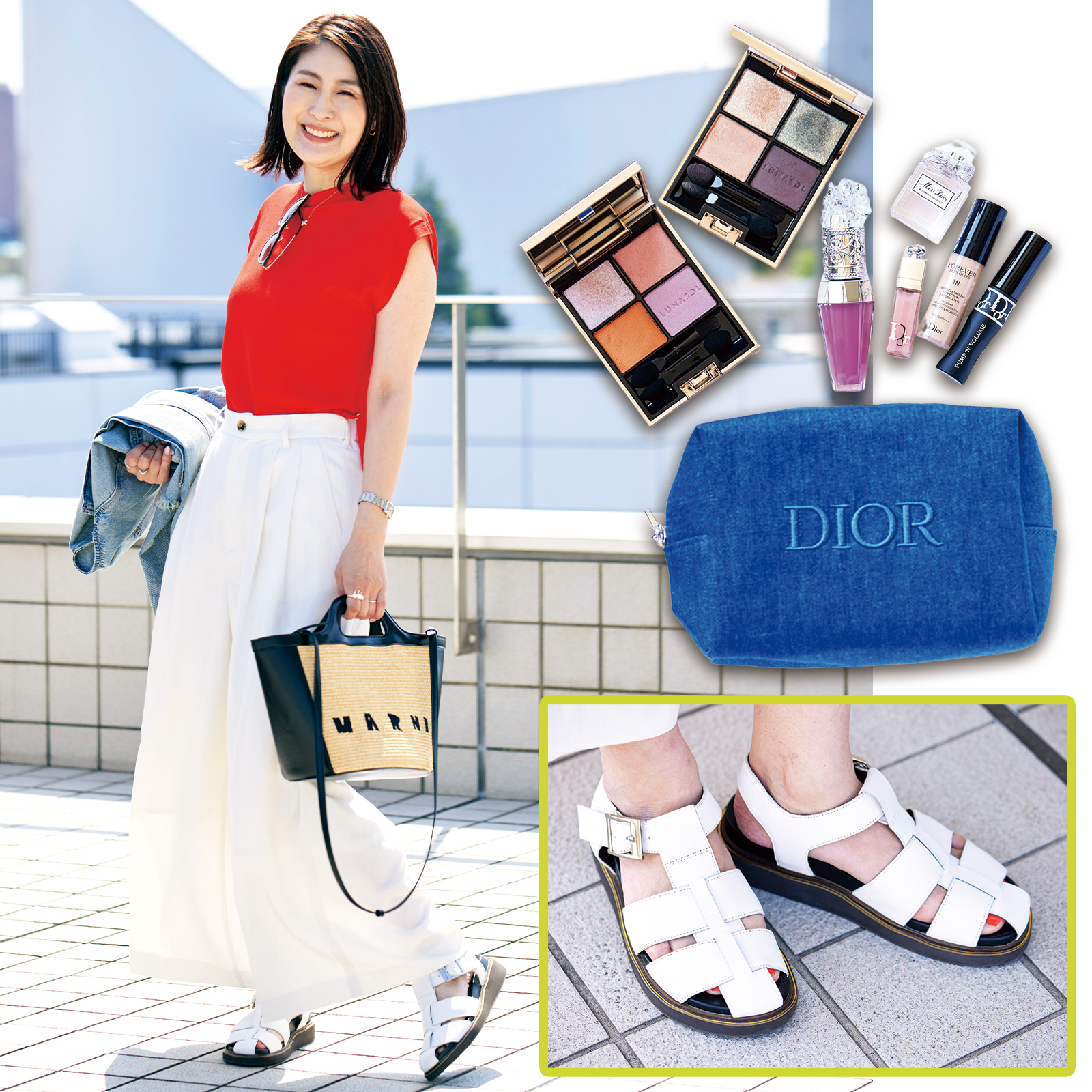 右上:ミス・ディオールの香水やミニコスメが入ったDIORのポーチはノベルティ。ジルのリップ(01番)やルナソルのアイカラーレーションは、つけるとパッと顔色が明るくなります。