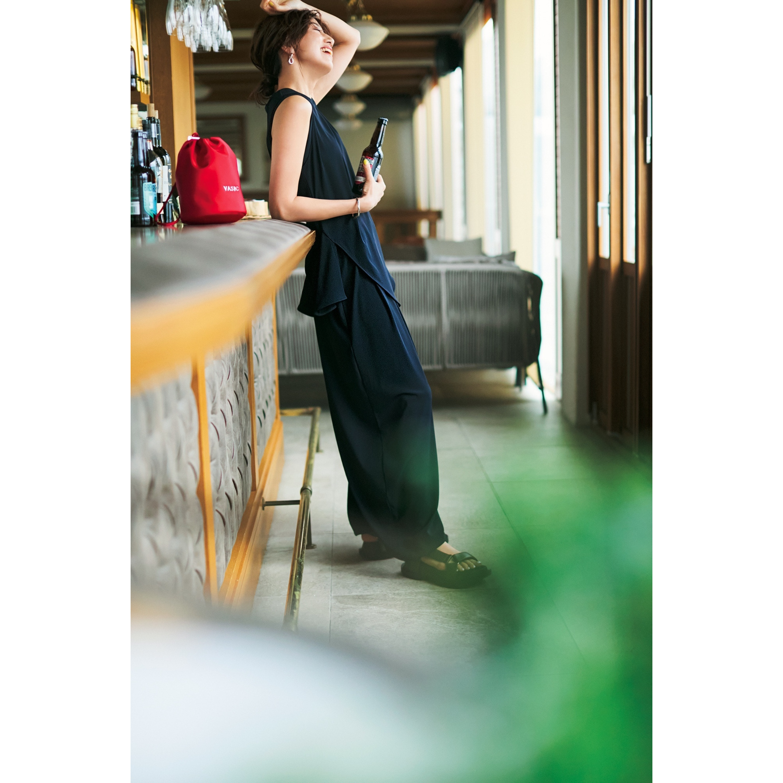 体型カバーとオシャレを叶えるブランドとしてVERY世代から人気を集める、ナゴンスタンスの水着素材のセットアップ。モードなバルーンシルエットが大人っぽく、レストランや街歩きにも行ける装いです。パンツとトップスはナゴンスタンス、サンダルはサクラのもの。