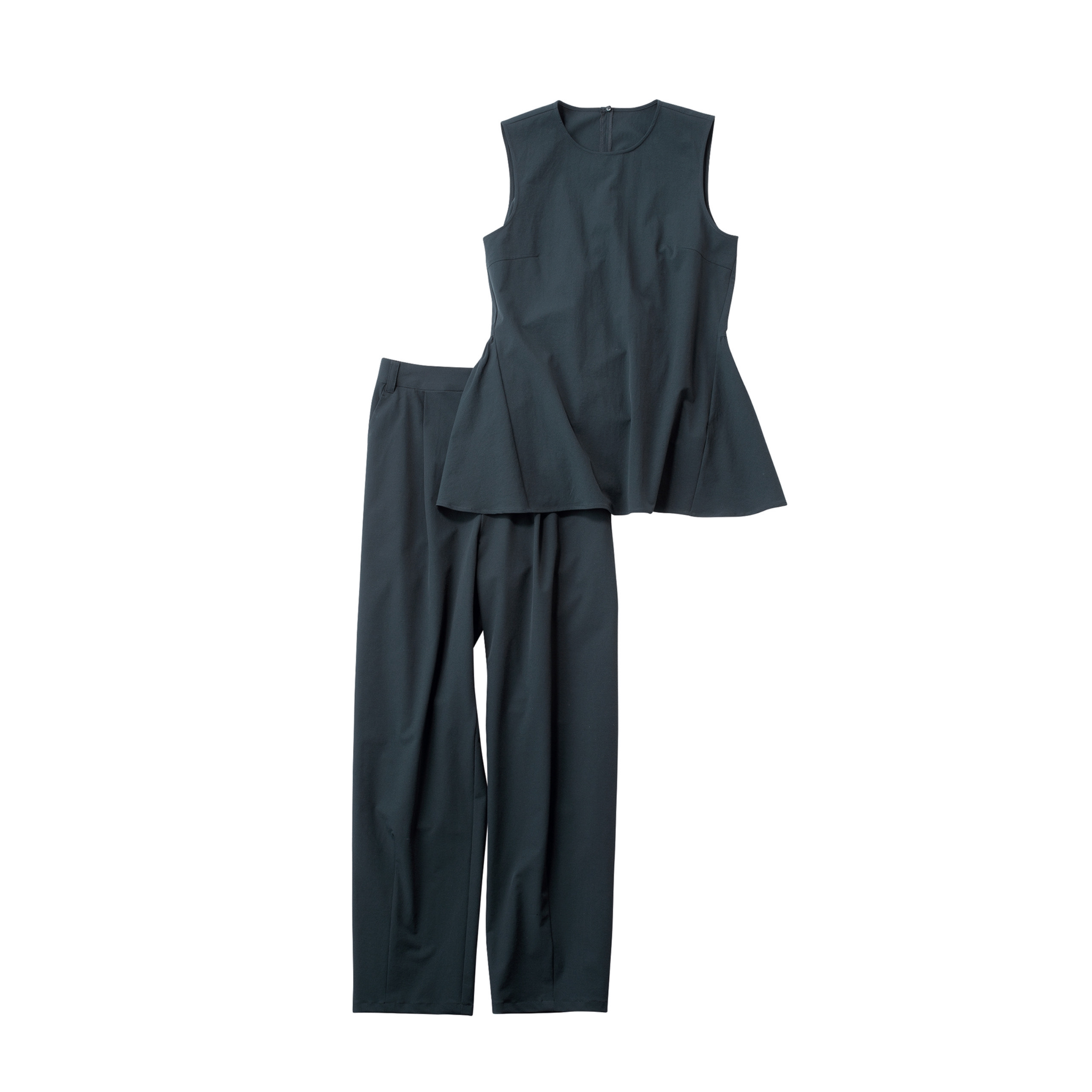 ペプラムトップス×パンツはバランス良く、ビーサン姿もサマになる