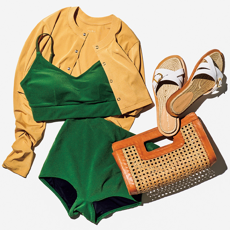 女性ディレクターが、子どもと水遊びするようになったのをきっかけに、理想の水着を求めて作ったブランドの速乾性の高いカーディガン。トレンドの短丈が可愛く、服としてもコーディネートしやすそう。コンパクトなので動きやすく、持ち運びにかさばらないのも魅力です。スイムカーディガンはDÅWN(ダン)、スイムトップス、ボトムスはスピード、バッグはバリ・ワークスタット、サンダルはペリーコ サニーのもの。