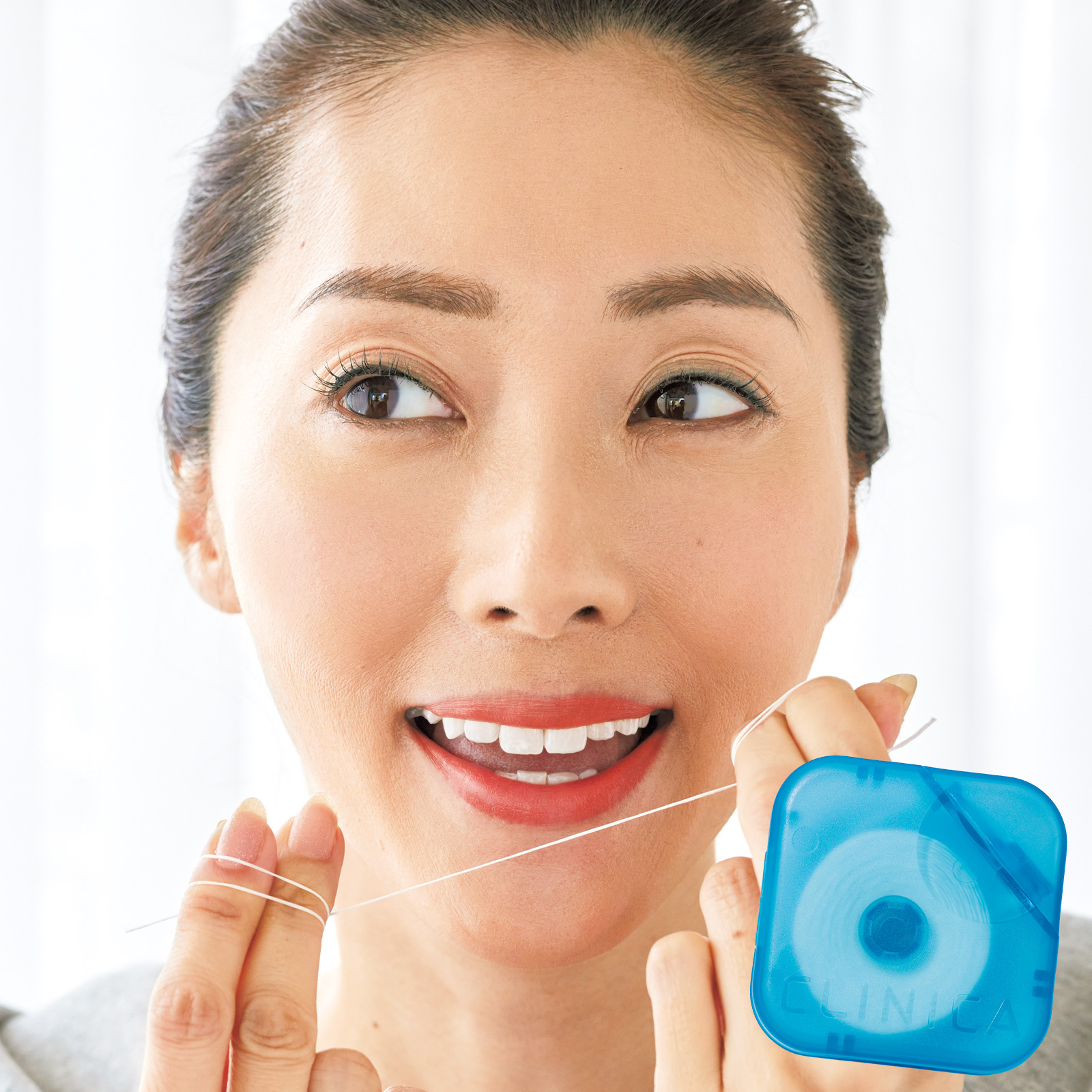 ❶朝食後はフロスでの歯間汚れケアから。歯茎を傷つけないようにやさしく。