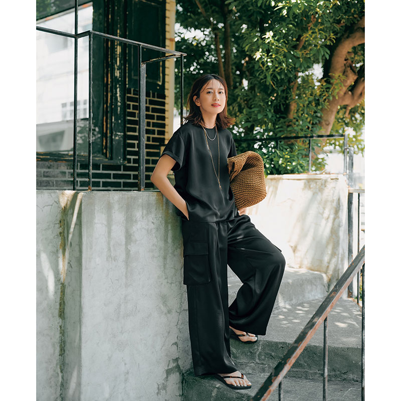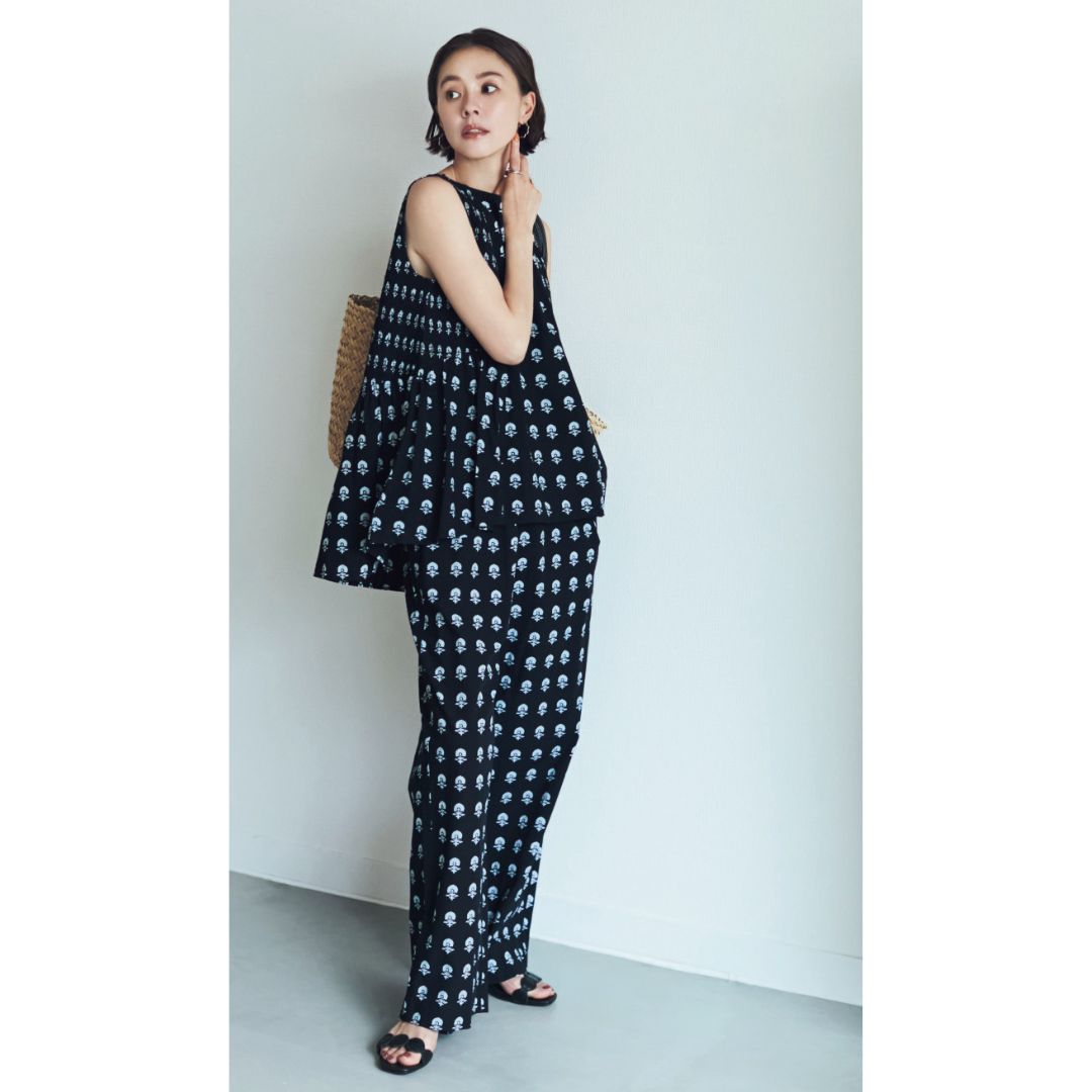 ブラウス¥9,900パンツ¥12,100(ともにエマテイラー/STYLEDOOR)ピアス¥85,800(モニス/フォーティーン ショールーム)バングル¥25,300(ワンエーアールバイウノアエレ/ウノアエレ ジャパン)バッグ¥16,500(ノマディス/ノーベルバ)サンダル¥14,850(ダイアナ/ダイアナ 銀座本店)