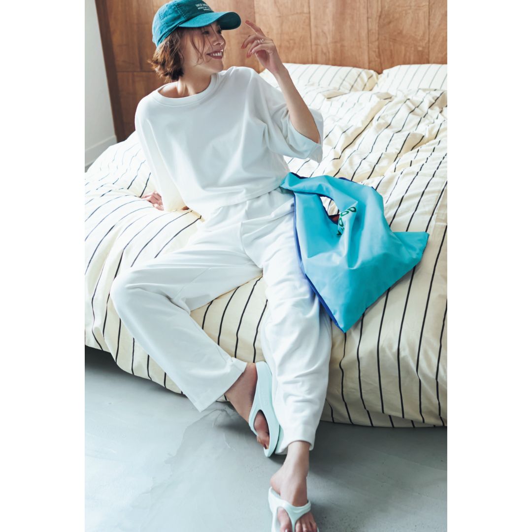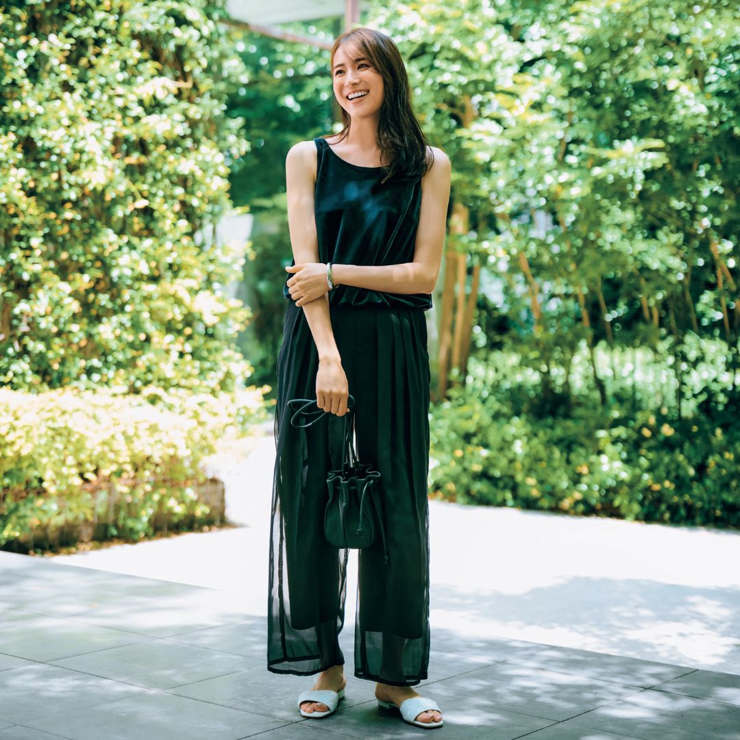 タンクトップ¥12,100パンツ¥19,800(ともにマロウブルー)バングル¥13,750(エイチアッシュ/フォーティーン ショールーム)バッグ¥22,000(ノマディス/ノーベルバ)サンダル¥14,300(ダイアナ/ダイアナ 銀座本店)