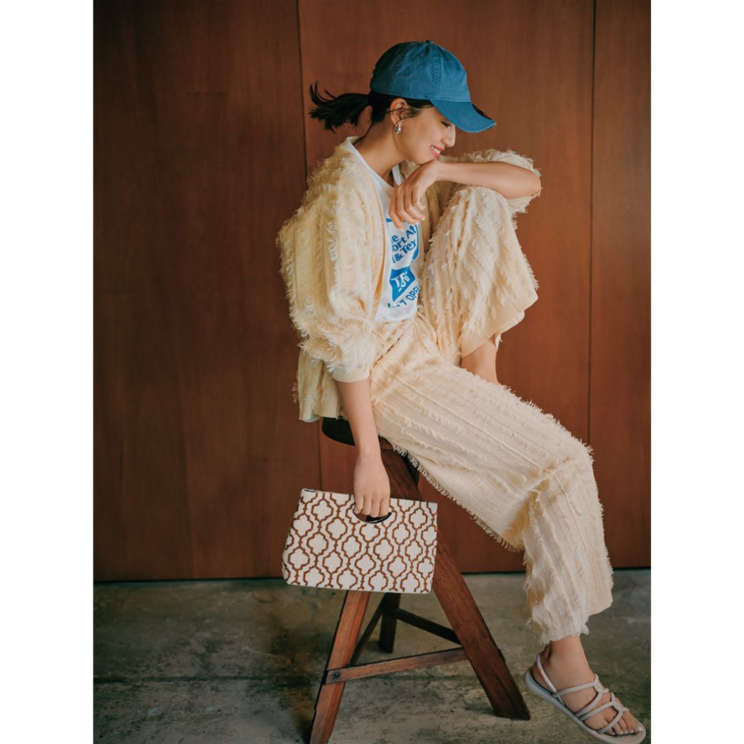 カーディガン¥29,700パンツ¥31,900(ともにスタイリング/ バイケイシラハタ/スタイリング/ ルミネ新宿 1 店)カットソー¥6,600(ハンドテックス×ジーンズファクトリー/ジーンズファクトリー卸団地本店)キャップ¥4,950(マイカアンドディール/マイカアンドディール恵比寿店)ピアス¥56,100(ミチウィルウェイ/フォーティーンショールーム)バッグ¥30,800(ニナバックズ/ピーチ)サンダル¥3,960(イパネマ/シードコーポレーショ)