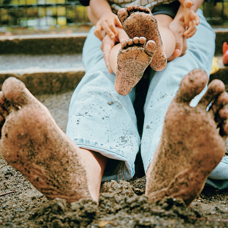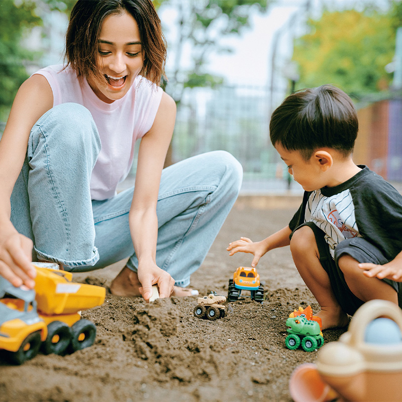 「砂場が大好きで、長男との公園遊びはいつの間にか自分も裸足になっています」と語るVERYモデルの木佐貫まやさん。汚れを気にせず思いっきり楽しむ、おおらかでハッピーオーラ満載のファミリーの「いつもの」公園遊びの様子をお届けします!