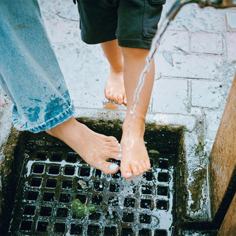 コンパクトなトップスに動きやすいパンツが公園での定番。「形と肌触りが好みなピンクのタンクトップはHanesのもの。ZARAのデニムは太すぎず細すぎずが最近の気分にフィット。汚れても洗えばいいやと思えると、ストレスがなく外で過ごせる気がして。すぐに脱ぎはきでき多少濡れてもOKなウーフォスは夫婦で愛用中」