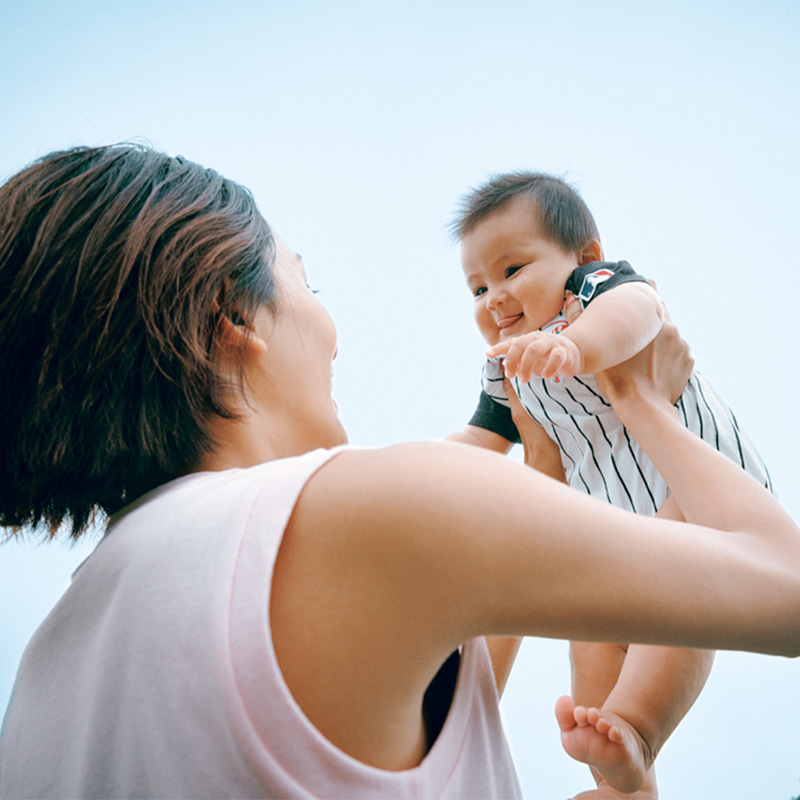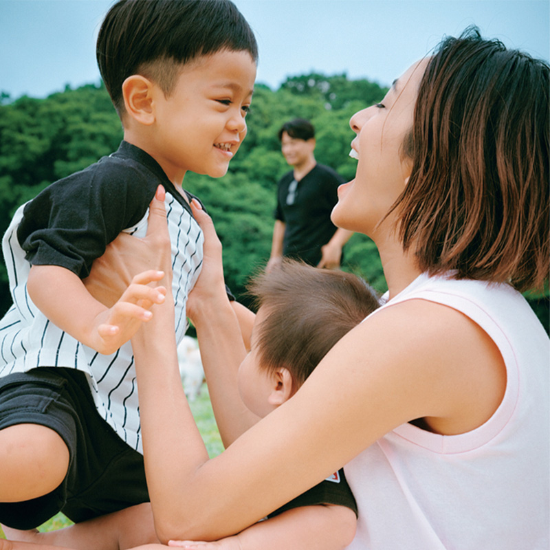 「いつもニコニコ癒しの次男。離乳食が始まって大変なこともあるけれど、食べる姿も可愛すぎて。ハイハイができるようになったら、さらに自然の中でのびのび遊ばせるつもり。子どもたちには、小さいことを気にせずなんでもチャレンジしてほしい。遊びからもそんなマインドが培われたらな、と思っています」