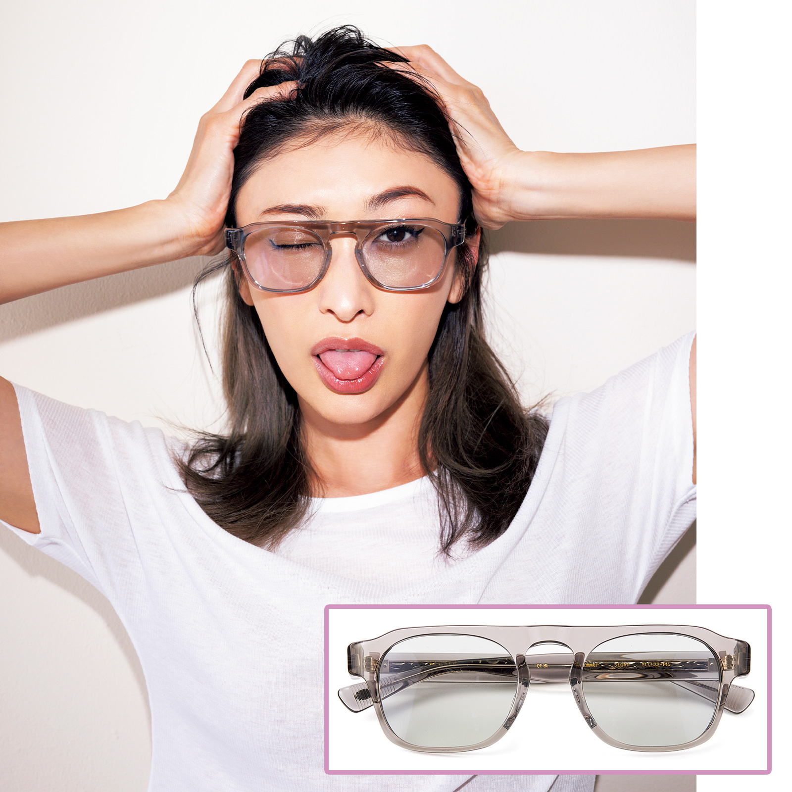 クリアなグレージュのフレームは肌なじみが良く主張しすぎないので、服を選ばず垢抜け感もプラス。おでこを出すと重くならず相性◎。[HESTER]¥44,000(プロポ/プロポデザイン)
