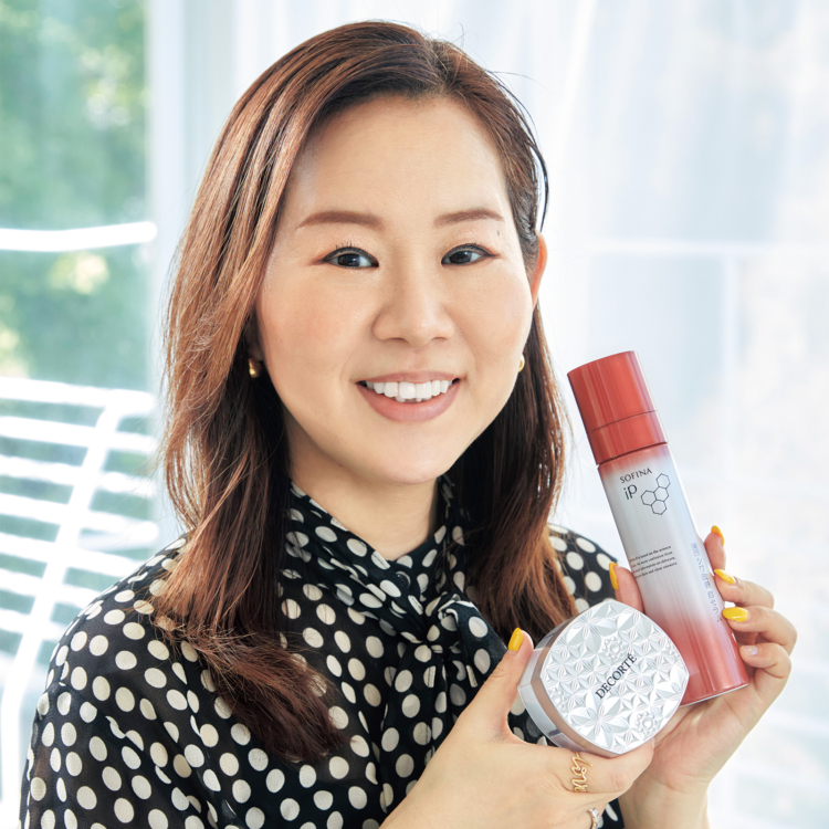 肌状態に合わせて様々なコスメを使い分け。多忙な日々を支えるのは一品投入で効果を発揮する高機能クリーム。「泡でケアできるSOFINA iPのシワ改善セラムはケアに手がかけられない時のお助けアイテム。くすみを払拭するコスメデコルテの4色パウダーも強い味方」