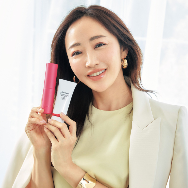 著作やSNSで発信される美容情報やライフスタイルが大人気。コスメ開発や神崎美容塾での後進の育成にも注力。「肌が変わるのを目撃できる楽しみと期待感をくれるホワイトショットがイチオシ。美容液感覚で使えてツヤのある透明肌に仕立てるSHISEIDOのプライマーもお気に入りです」