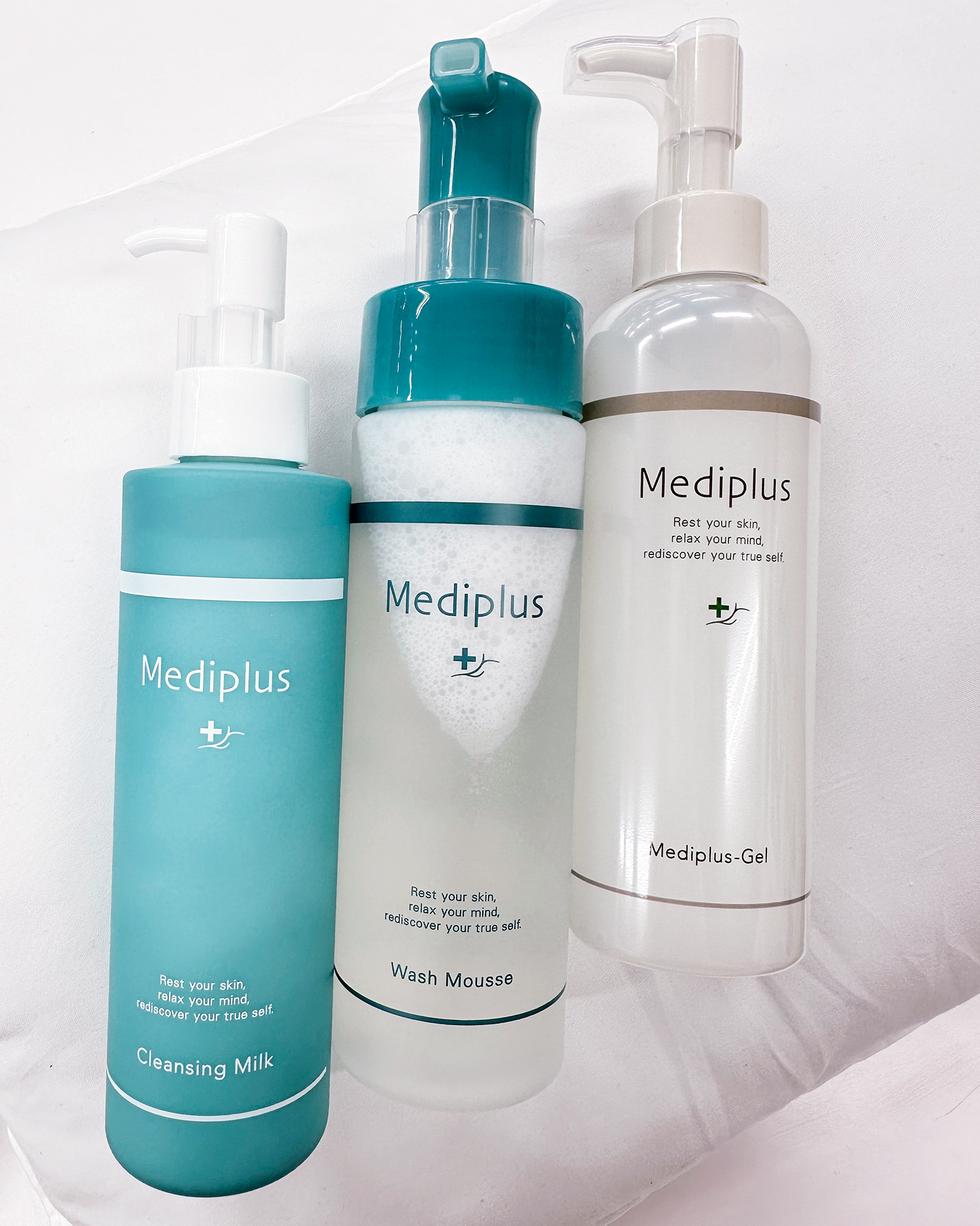 大特集テーマ“タイパ・コスパ美容”は私自身も特に意識していて、8年ほど愛用しているメディプラスのオールインワンゲル(写真右)。ポンプ式で使いやすいだけでなく1本でしっかり潤って乾燥知らず、肌荒れが起きなくなりました。6月にはクレンジングミルク(左)とフォーム洗顔料(中)が発売されライン使いをスタート。肌負担の少ないミルクタイプなのにしっかりメイクが落ちるし、ポンプを押すだけで出てくる濃密泡仕上げの洗顔もばっちり。美容成分が80%以上配合と相乗効果が楽しみです!