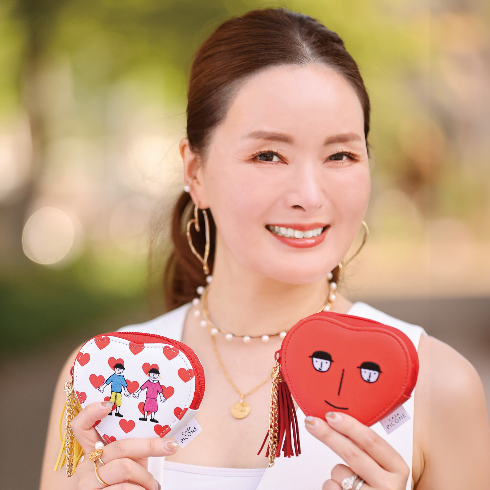 ポーチ2つはCASA PICONE×BABBIのコラボ。ピアスはLani Couture。デザイン性があり、子供っぽくなりすぎないので大人でも◎。