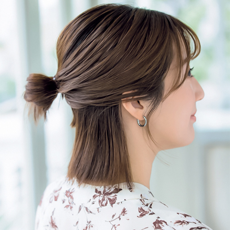 サイドの毛を少し残してハーフアップにしながらゴムでお団子を作ります。耳を隠すようにサイドの毛をピンで留めると古臭さのない仕上がりに。前髪もこめかみに流すことを意識します。川原江里菜さん(VERYライター/4歳男の子ママ)