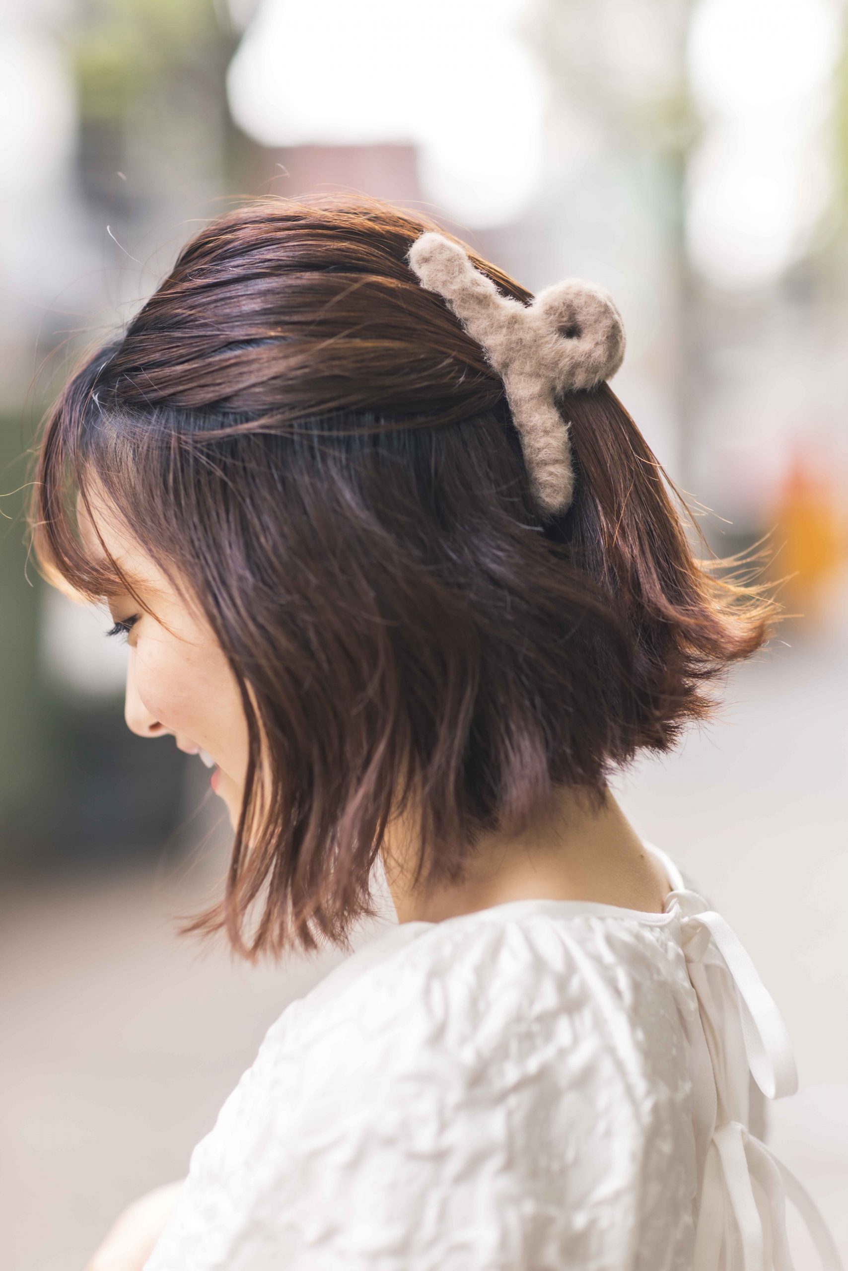 「産後にボブヘアにしたのをきっかけに、デザインにひと癖あるヘアクリップをコレクション。このヘアクリップはモコモコの素材感がめずらしく、ノーアクセでもちょい盛りできるので助かります。この日は、髪全体をランダムに巻いた後にトップの毛を少量取り、手ぐしで整えてヘアクリップで固定。抜け感を出すために、あえてブラシを使わず手ぐしでまとめるのがコツです」澤井レナさん・26歳/155cm(2歳女の子のママ)