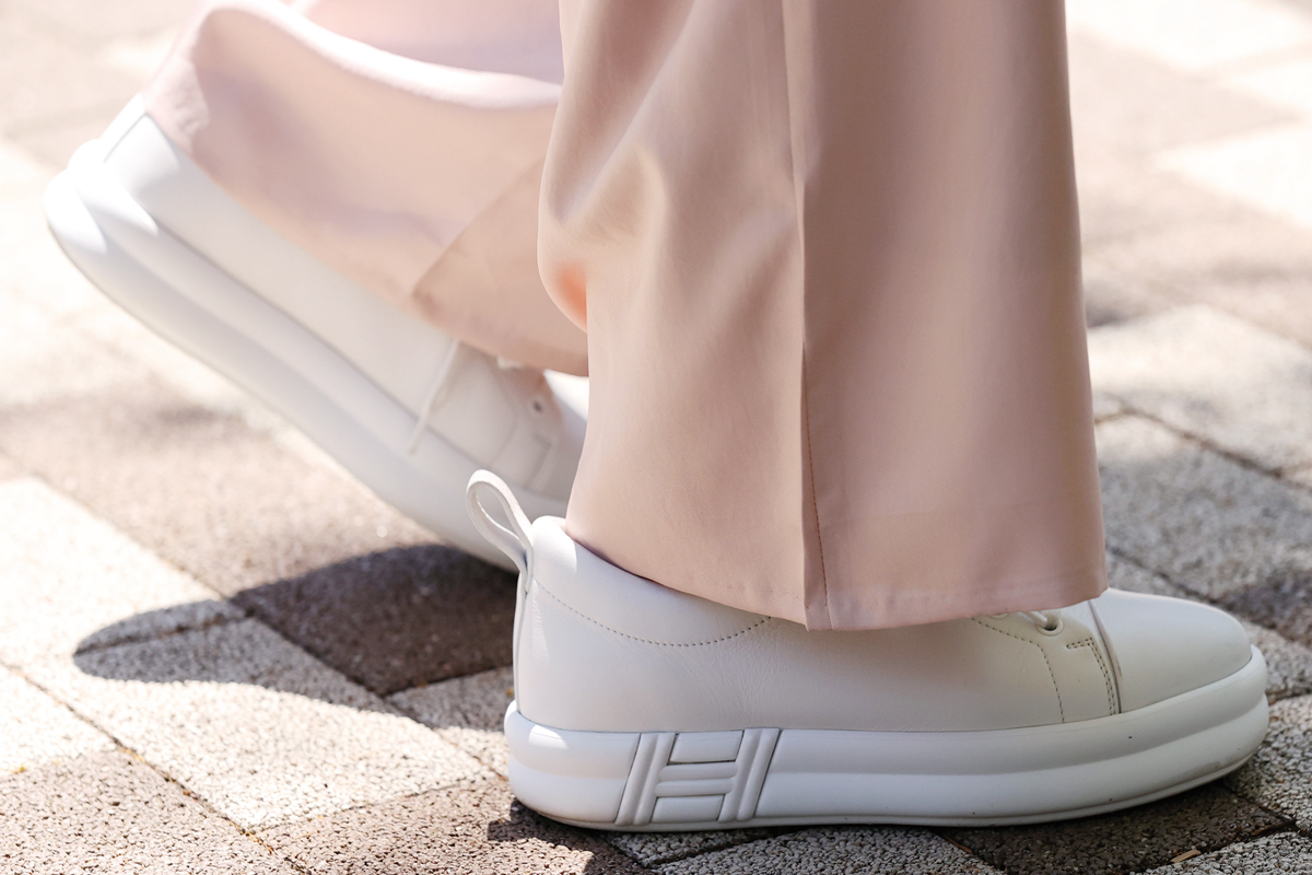 ハイブランドのスニーカーならキレイめな服にも合わせやすく、おしゃれなカフェやデパートにも履いて行けます。このエルメスは厚底だからスタイルアップも叶います。