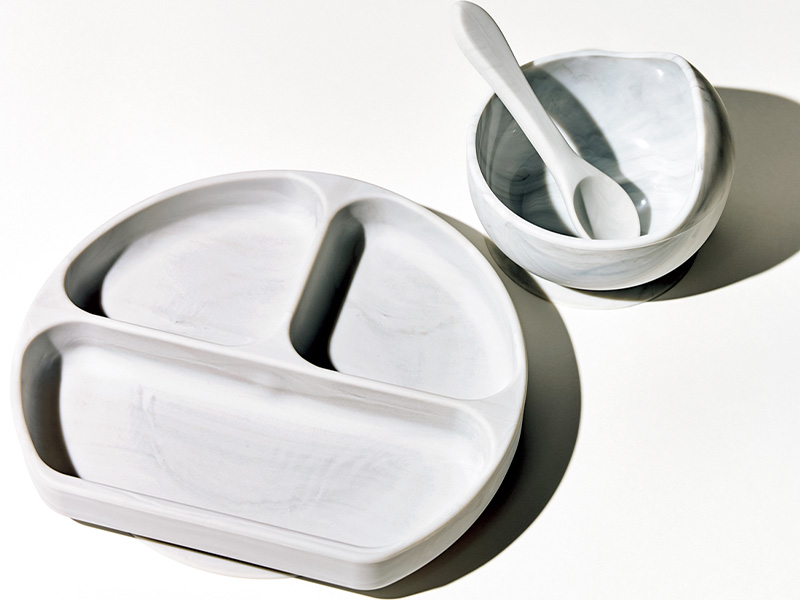ORDER:公式オンラインストア、各種オンラインストアにて購入可。プレートは手前の形状が直線で体に引き寄せやすく、ボウルはすくいやすいアーチ状。自力で食べる力を育むことができる3点セット。電子レンジ、冷凍庫も対応可なのがママには嬉しい!